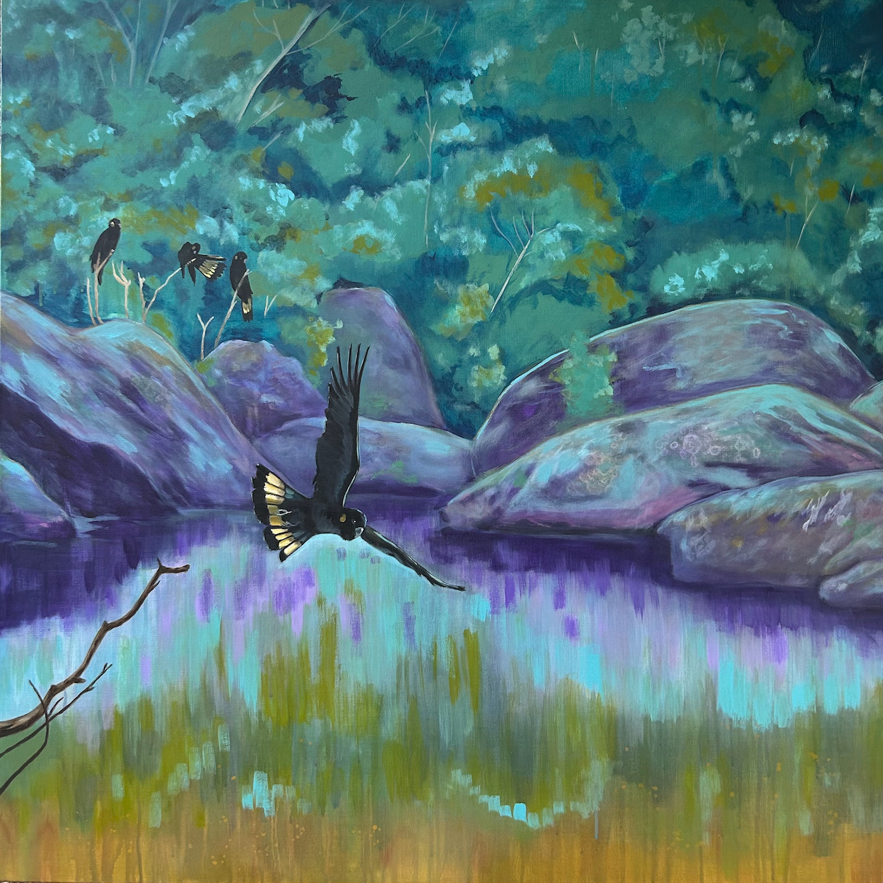 The naturally occurring pool is named so because its shape resembles a jellybean. It is part of the Beautiful Blue Mountains and is a perfect place to visit for a picnic or swimming. Yellow-tailed Black-Cockatoos are often seen in small family groups. The black cockatoo represents the power of spirit come into your life. It could be a strengthening of your own spirit and soul. Black cockatoo energy tends to be celebratory and can bring about empowerment, happiness and contentment. Feng Shui tells us water is extremely important as it symbolises prosperity and abundance. While trees always symbolise vitality and growth. This painting is filled with Feng Shui energy and symbolism.