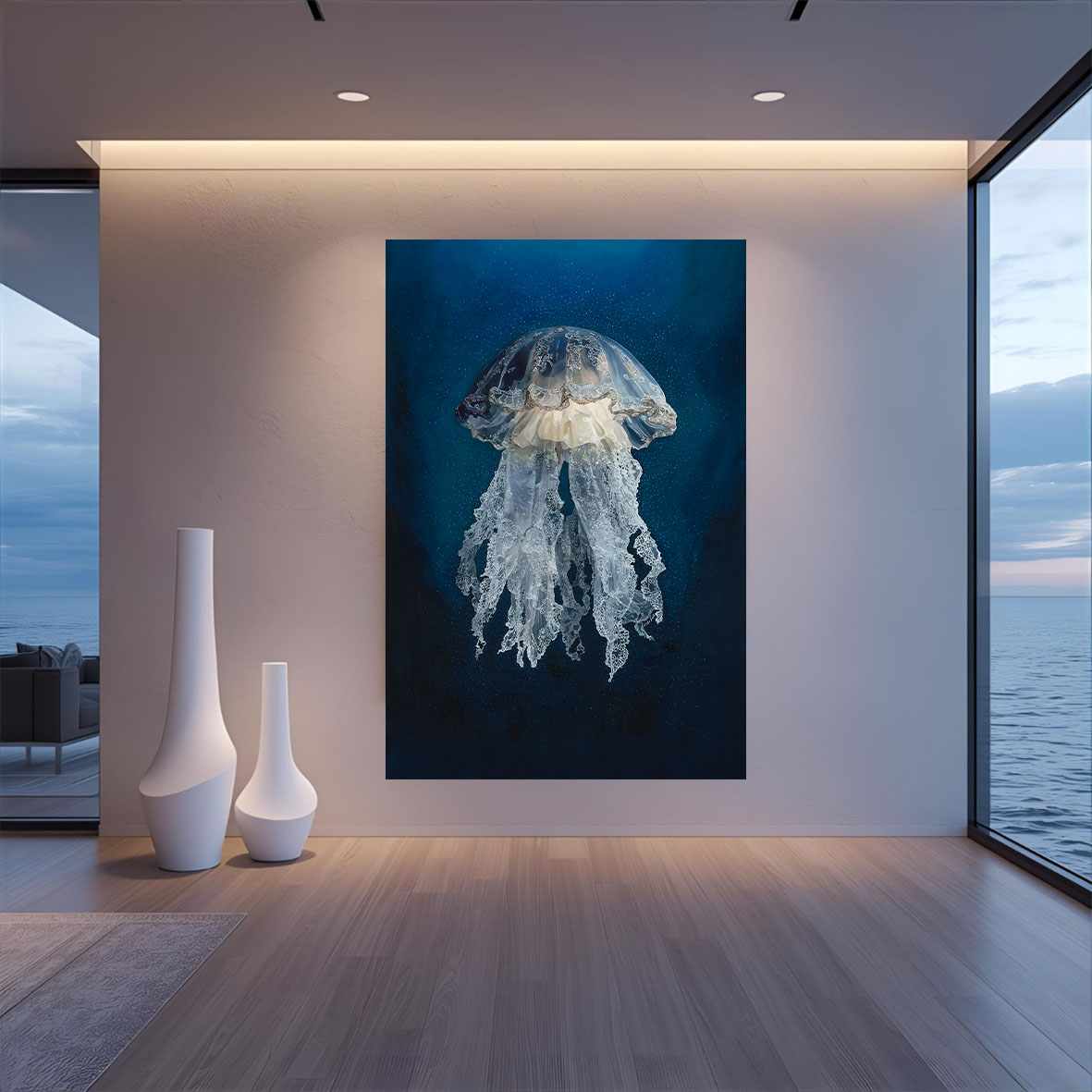 This piece is a thread from my existing signature into a new direction. Weaving the intricacies of lace with the stillness of the jellyfish.