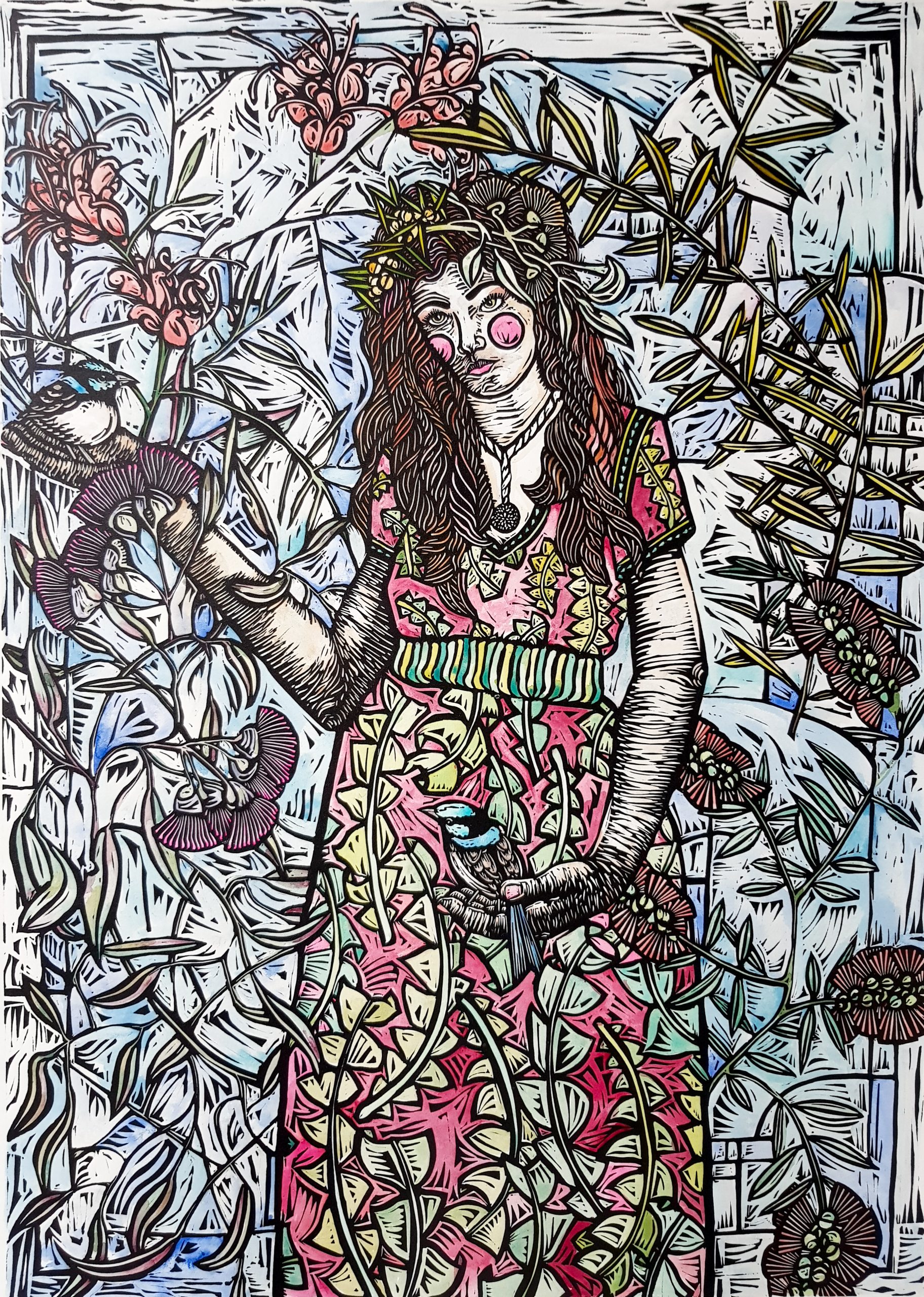 Jemima is a handcoloured linocut depicting a beautiful woman holding two splendid fairy wrens and a dress patterned with banksia leaves. The background is filled with bottlebrush, wattle, grevillea and gum flowers. The lino block is carved in an expressive way to create an energy in the work and it is coloured in such a way to accentuate the dress.