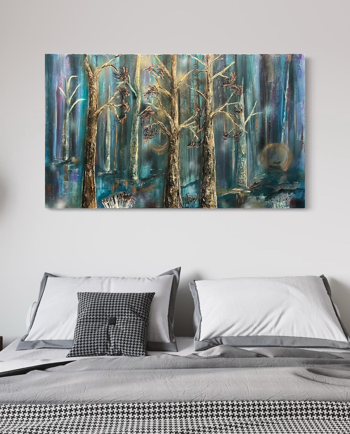This beautiful painting highlights the ethereal light that shines through the forest on a winter’s evening. The copper and gold pigments of the textured bark on trees glisten as your eyes are drawn into the magical hues of blues that blur into the background.
