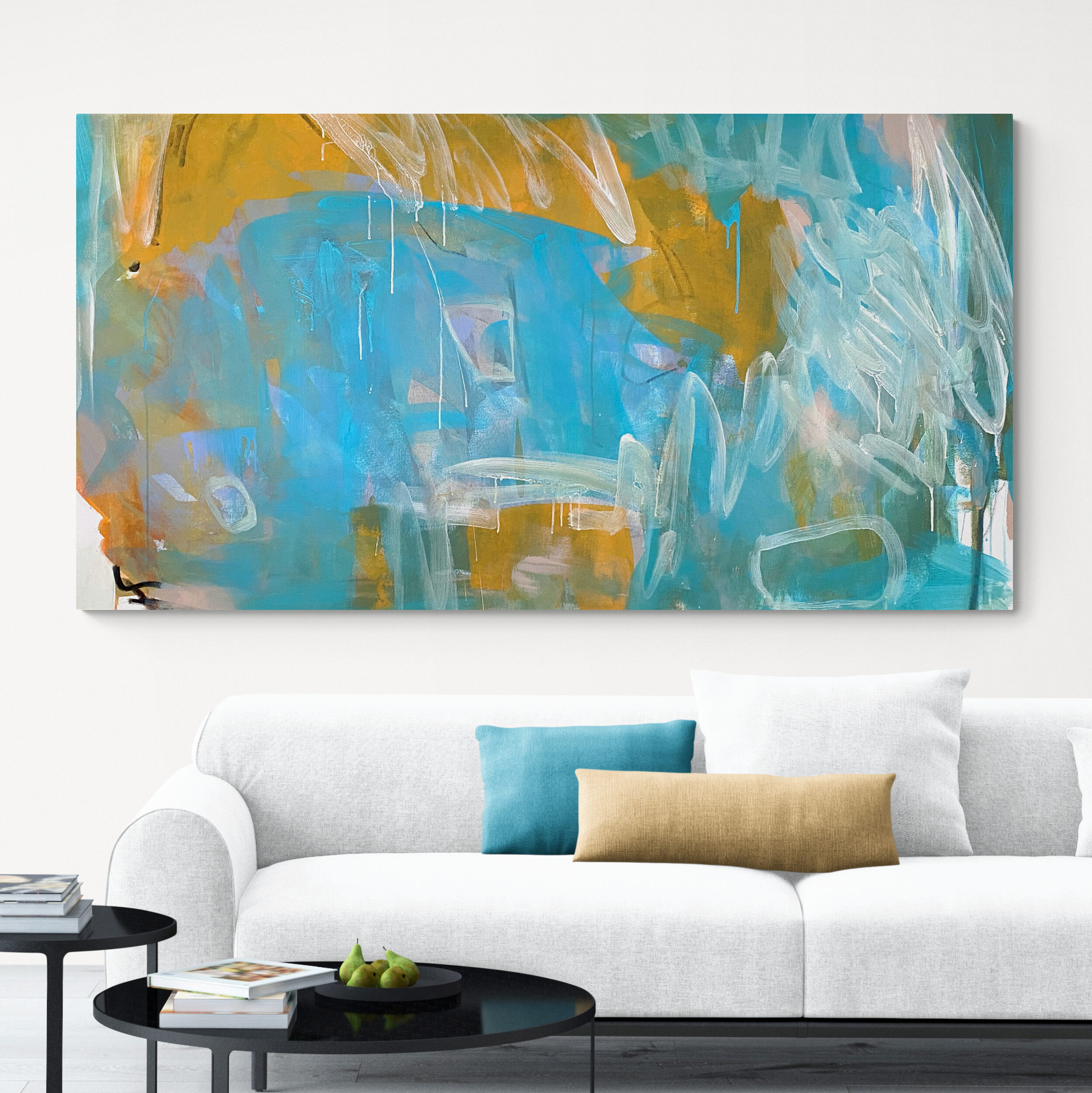 It’s gestural mark making combined with its vibrant palette of beautiful light and turquoise blues, white, beige and warm ochre and neutral tones mixed with pops of complementary orange and violet makes this statement piece a joy to spend time with.