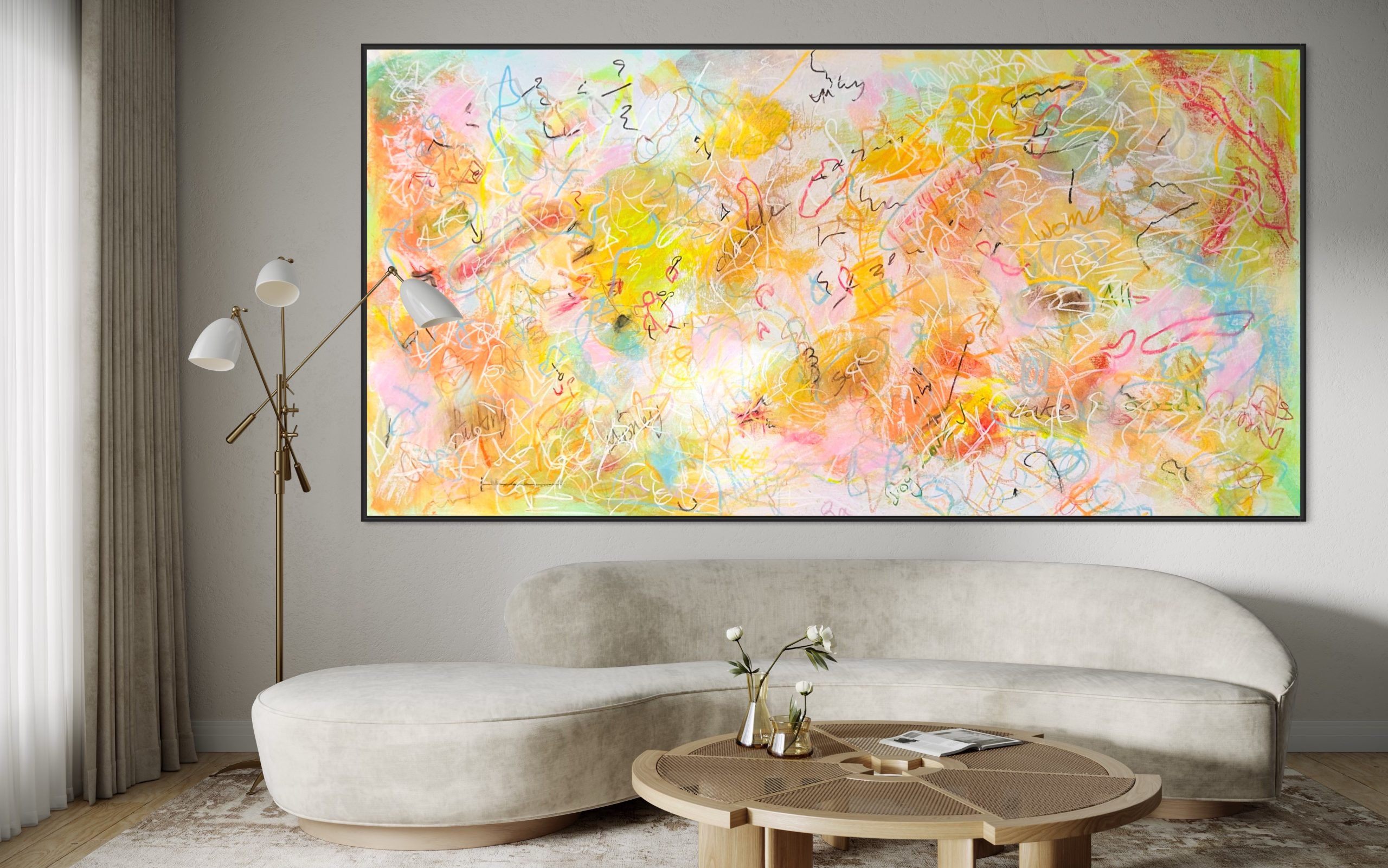The composition is balanced yet dynamic, with the unusual marks guiding the viewer’s gaze across the canvas. The size of the painting allows for a captivating visual experience, with the viewer immersed in the captivating interplay of colors and crayon markings. This abstract masterpiece invites interpretation and reflection, encouraging viewers to find their own meaning within the vibrant and unconventional tapestry of marks and colors.