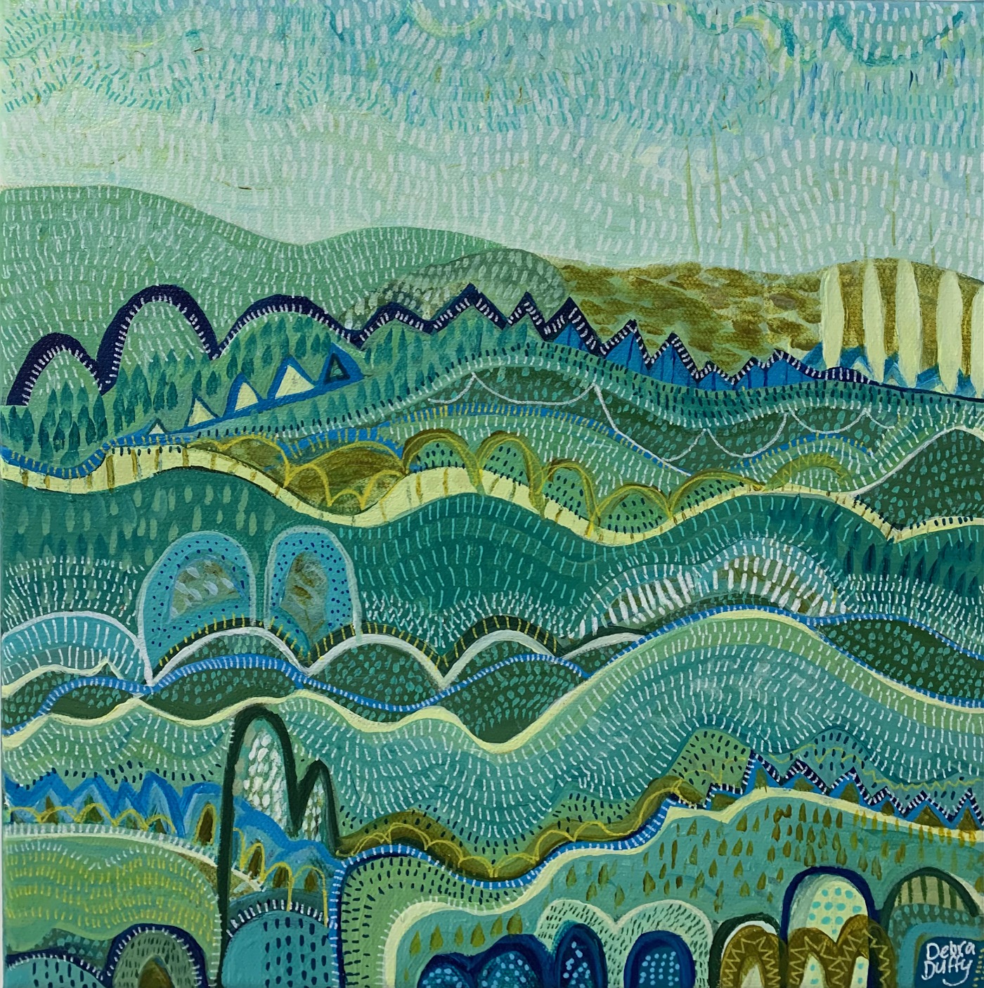 This artwork is an original abstract style landscape painting using acrylic paint and artist markers. My inspiration has come from my many happy memories while on holidays touring Europe with my husband many moons ago, and one of my favourites was when we discovered the charming and petit countryside especially in the South of France, and this artwork expresses my feelings of that nostalgic time. This artwork consists of muted greens, blues and whites and green gold colours while using intricate patterns and mark making to create layers in the landscape.