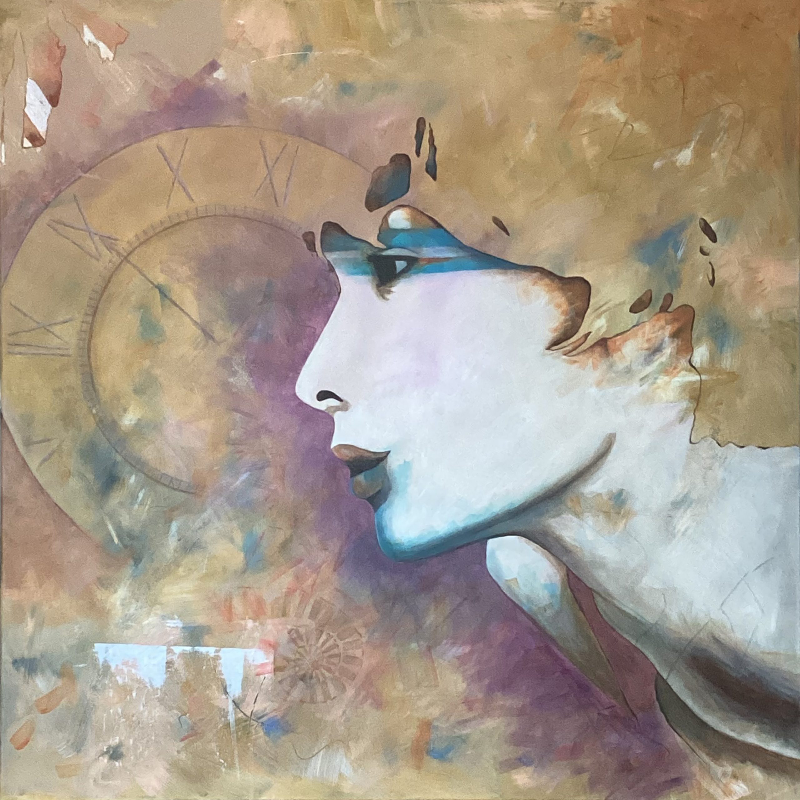 “Journey” is a new painting by Teresa which takes the idea of non-linear time. In this series “Timeless” she selected beautiful Australian locations and let them transcend through the artwork. In this painting the Bay of Fires in Tasmania was portrayed within Mother Gaia, the lines of the rocks, the orange of the rocks and the blue of the ocean. She is ripping through time, looking at the clock (our version of time) and a fossil trying to break through the fabric of life. She reminds you that time is not just one concept and to be free of time you have to break through it.
