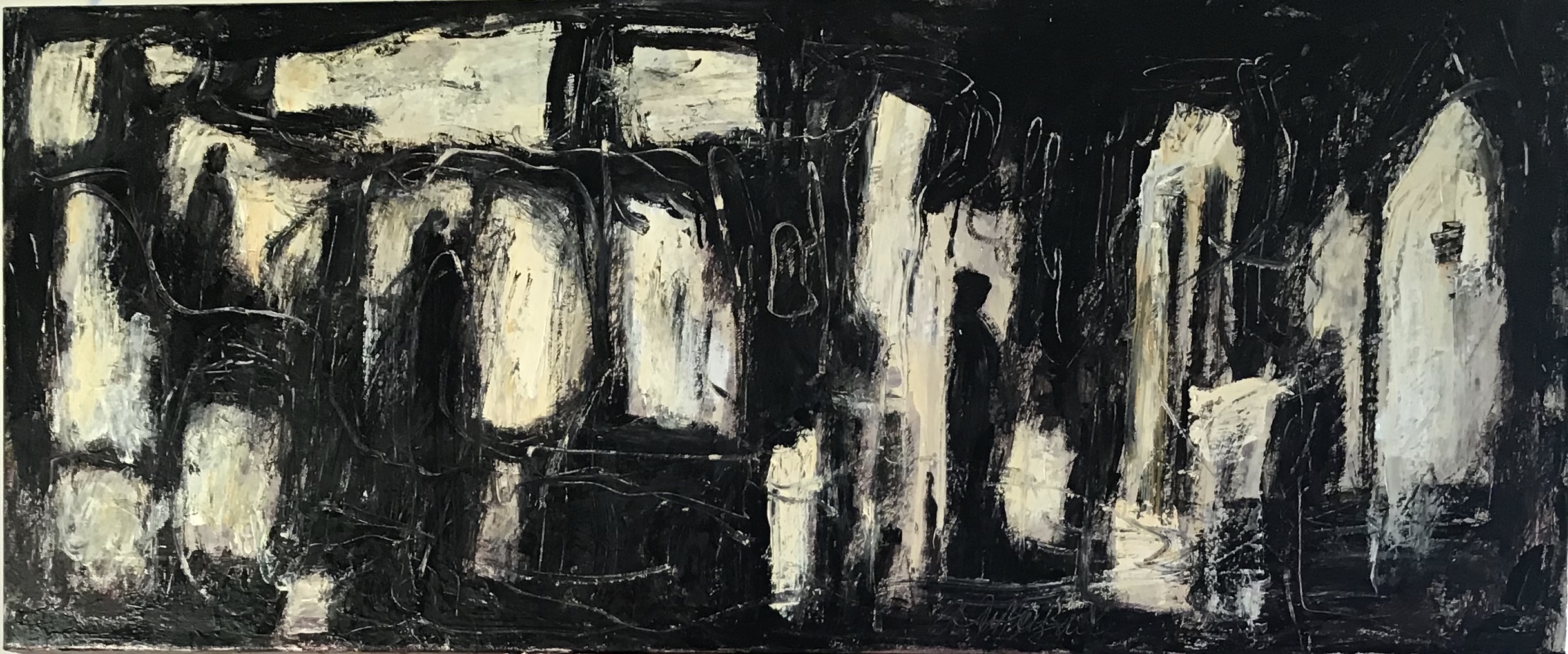 Journey by Carita Henriksson – A journey of my family’s evacuation from Viburg, Finland, now Russia. Human shapes reminiscent of a fleeing family. Shapes, be they buildings or rocks interest me. A little bit of mystery thrown in.