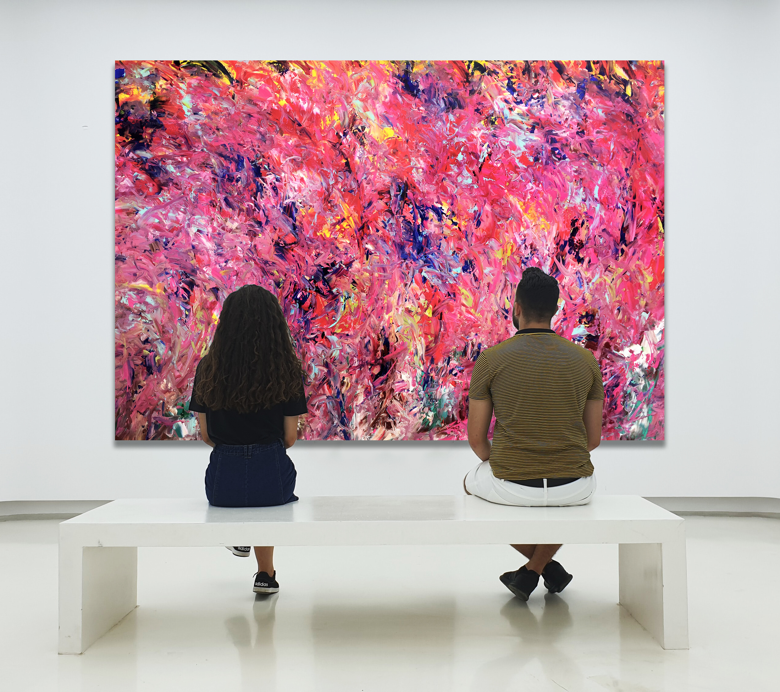 This work is painted on 12 oz gallery canvas and has been sealed with varnish. The canvas is hand-stretched onto a frame is 198 cm in width by 137 cm in height.