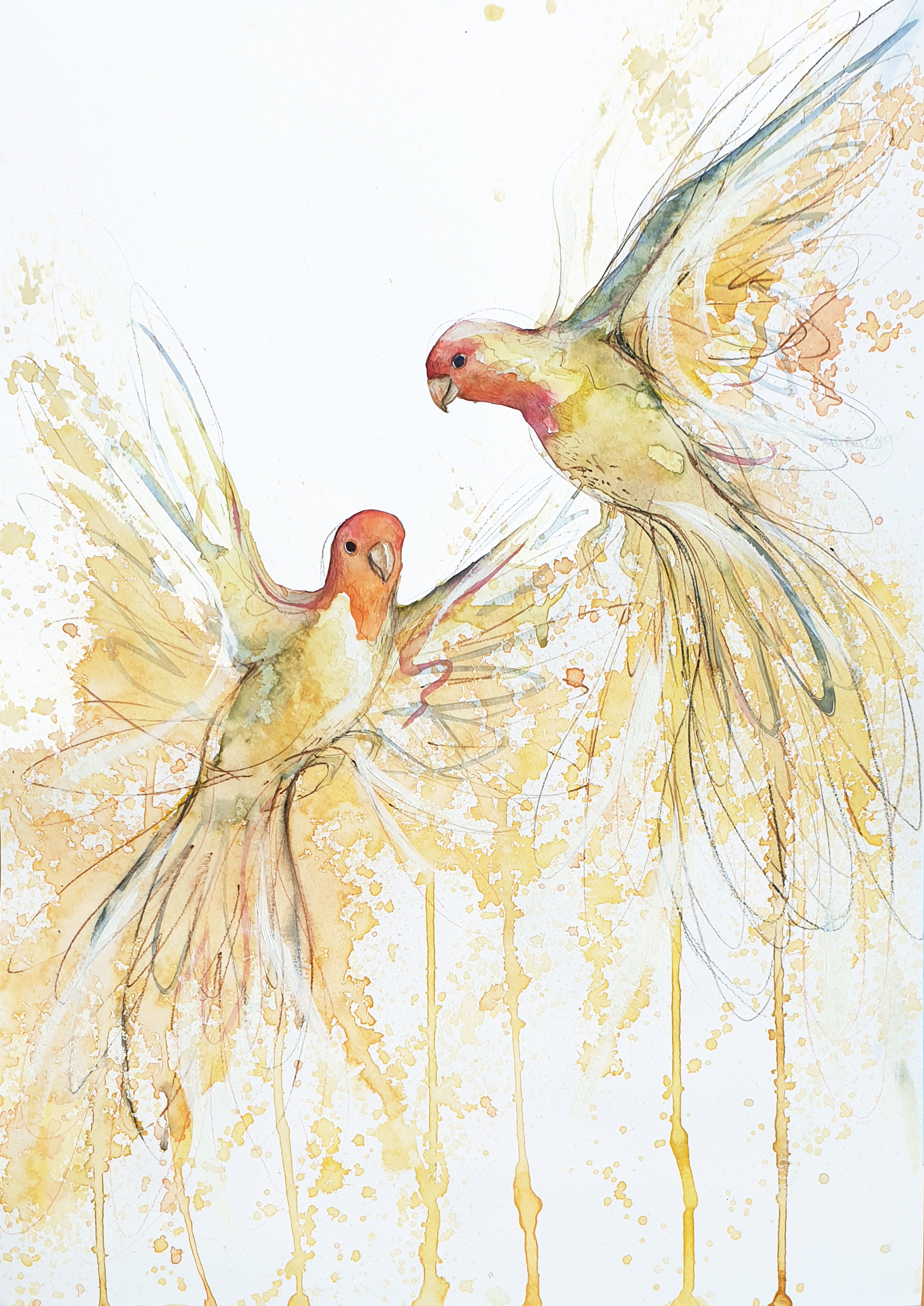 “Joy in Flight (Sun Conures Flying)” by Sydney artist Leni Kae is an original watercolour, pencil, acrylic painting on paper. It features two Sun Conure birds flying; expressing freedom, joy, and the playful energy of the Sun Conure bird. Sun Conures are also loyal companions, so the composition of the two birds together also reflects the bond and companionship they bring. A beautiful, joyful art collection piece for bird lovers.