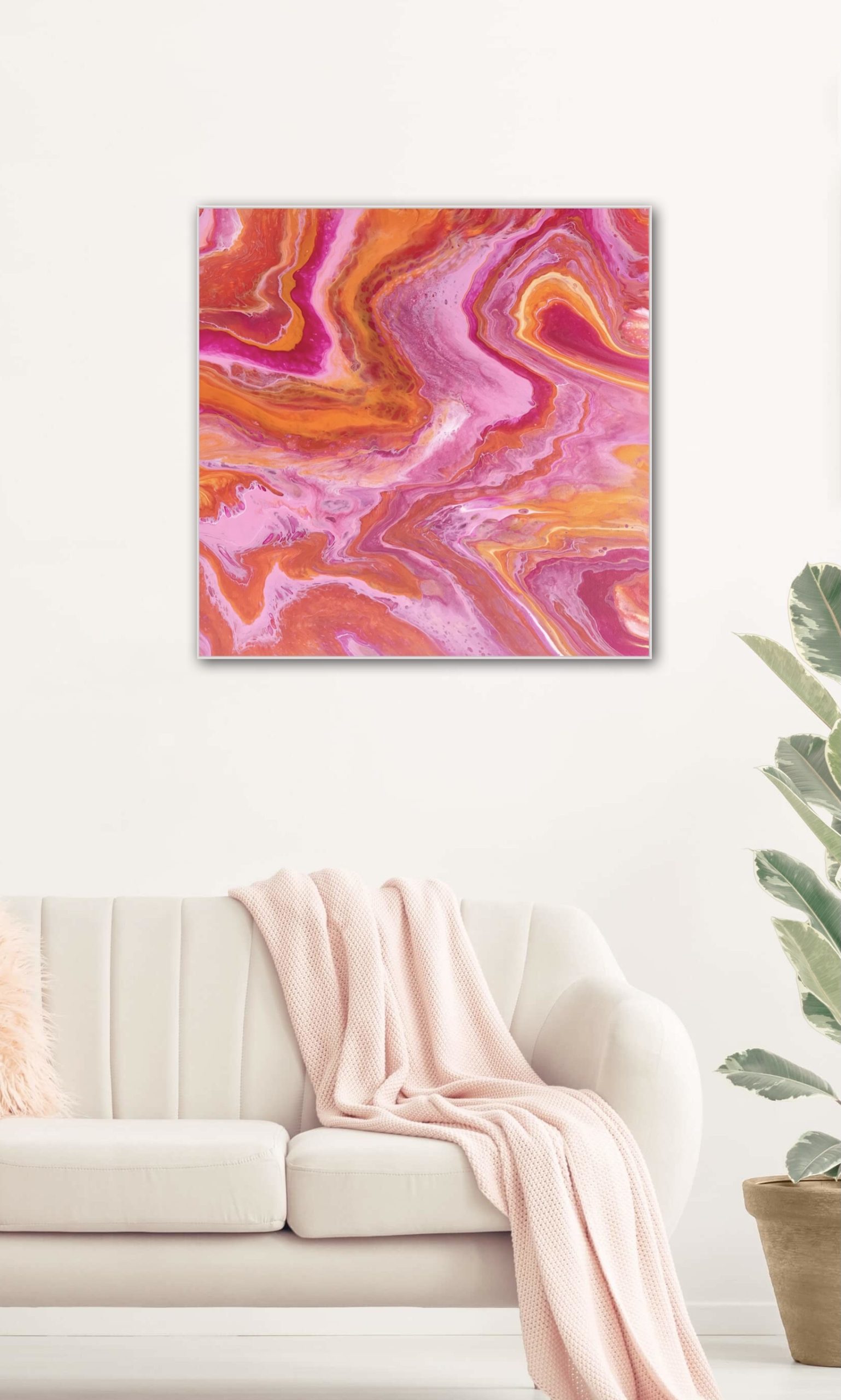 Joyful Spirit is a vibrant colour explosion… Layers of pink, magenta, orange, golden yellow and touches of white flow together in a harmonious rhythm, creating a sense of warmth and happiness that will brighten your space. Joyful Spirit is painted on a deep edge gallery-wrapped canvas, with the colours flowing over the sides for a polished, seamless look from every angle. My artworks are designed to look stunning unframed—and come ready to hang at no extra cost.