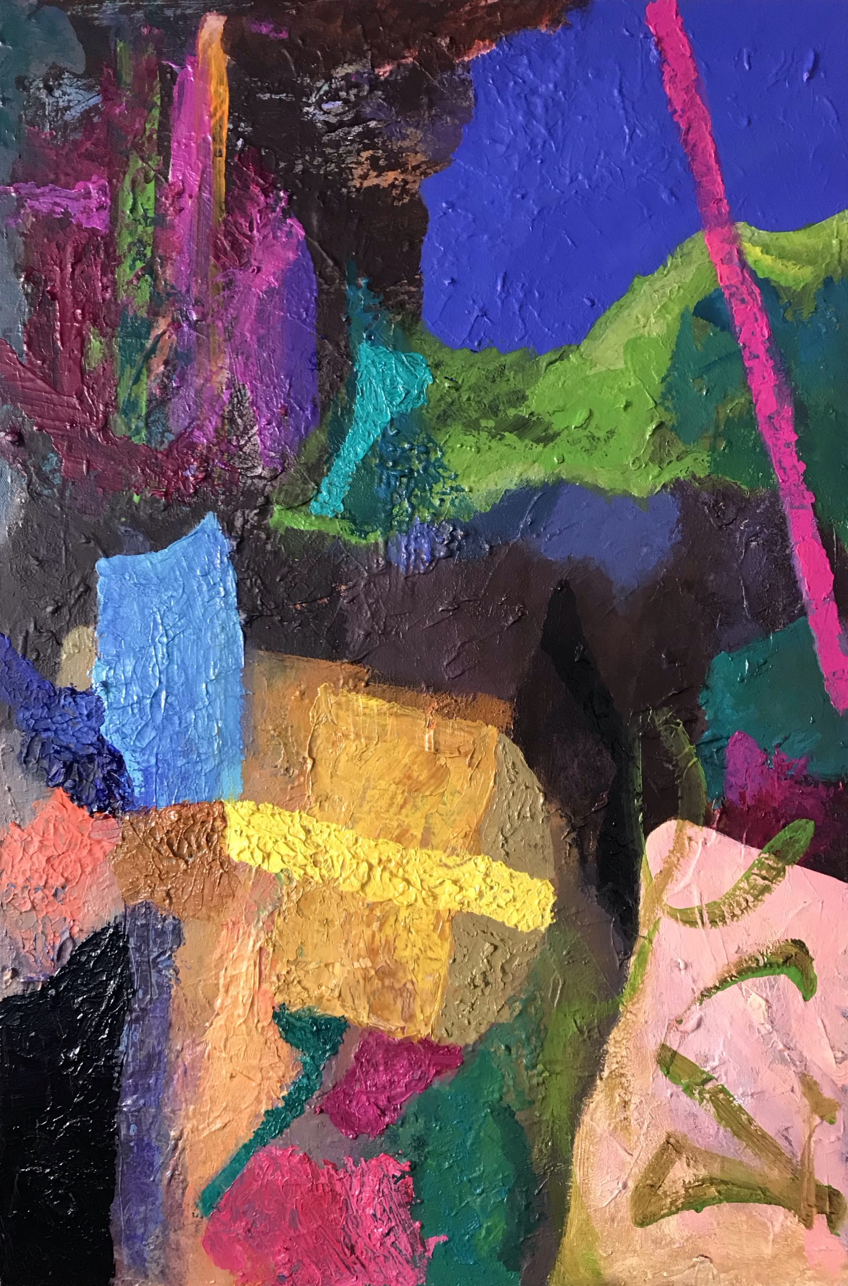 This work contains an abundance of layers and textures with glossy oil and matte finish acrylic with opaque and transparent paint, light and dark values all added with passion for the medium.