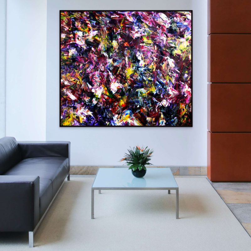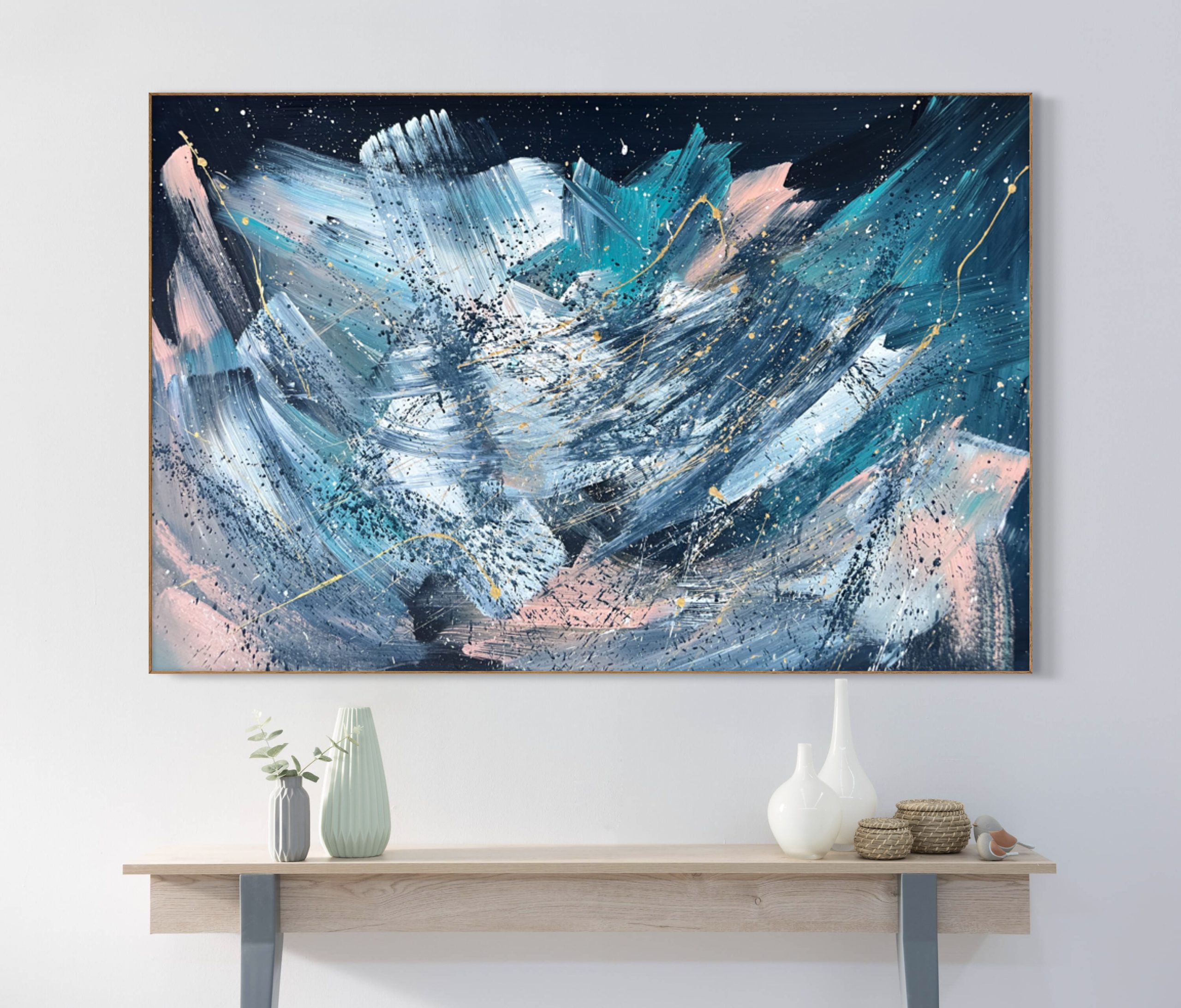 This fun and energetic abstract has some metallic gold that changes in the light on top of the many layers of large brushstrokes and paint splatters. It appears to be an organic abstract, although the placement of colour, movement and light is intentional to create the right balance and can be hung either way.