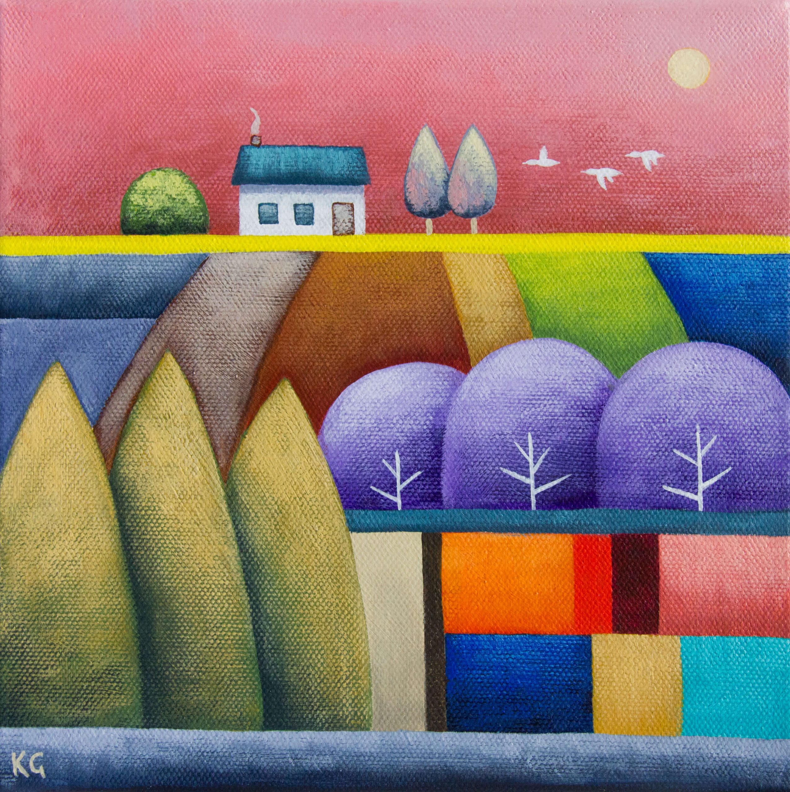 Juicy Pink – Petite by Kate Graham. This small square landscape features a pink sky with sun interwoven with a patchwork of green, orange, purple, blue and yellow fields and trees below. House sits on horizon with flock of birds passing by.
