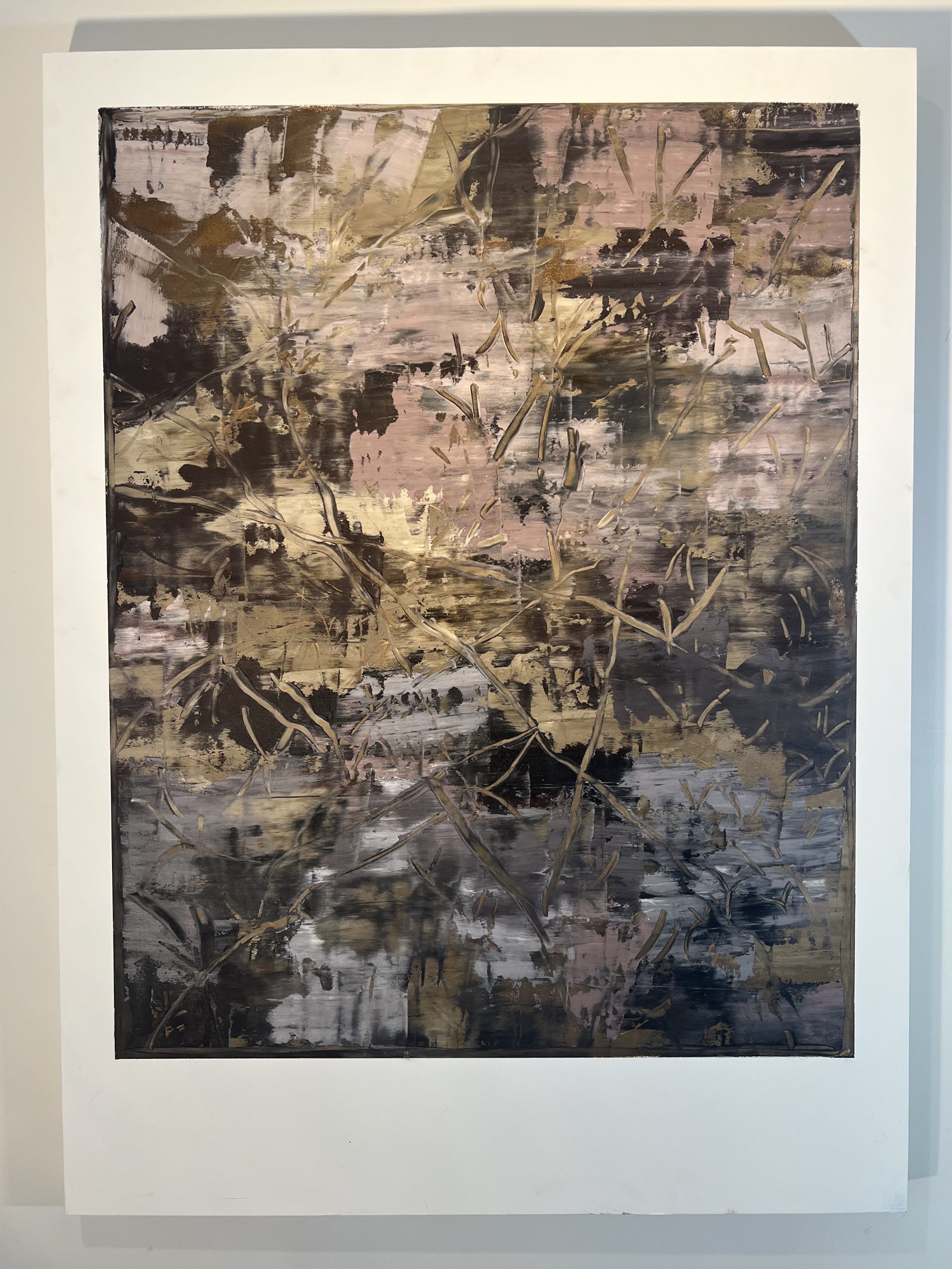‘April’ is a richly atmospheric painting conjuring the last Autumn wattle as the season shifts from Autumn into winter. The entire substrate is primed archival Dibond. The palette comprises delicate neutrals and pinky greys. The white painted border is an integrated part of the image, creating a framed effect and as such the painting does not need additional framing (although you a free to do so). The purpose of the border is to create a window of aesthetic contemplation and a particular experience of perception.
