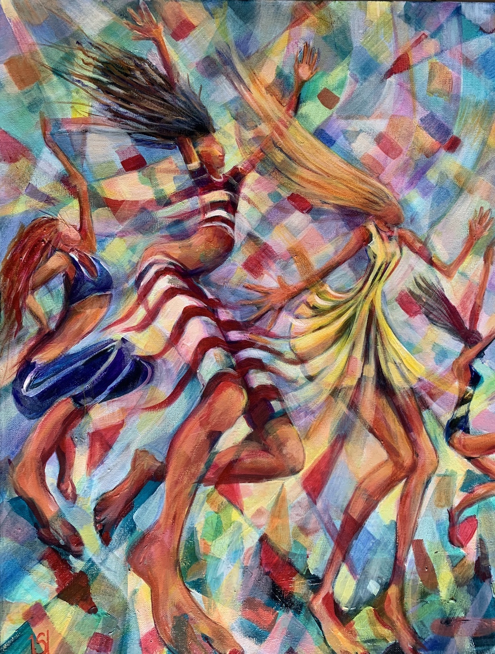 A happy colourful semi-abstracted acrylic painting of four figures leaping in the air! The surface of this original acrylic painting is broken into tessellated geometric shapes giving the four figures movement.  Originally, I painted the elongated four female figures monochromatically and then added colour to the whole, extending parts of their clothing and figures and breaking up forms with prisms of colour.
