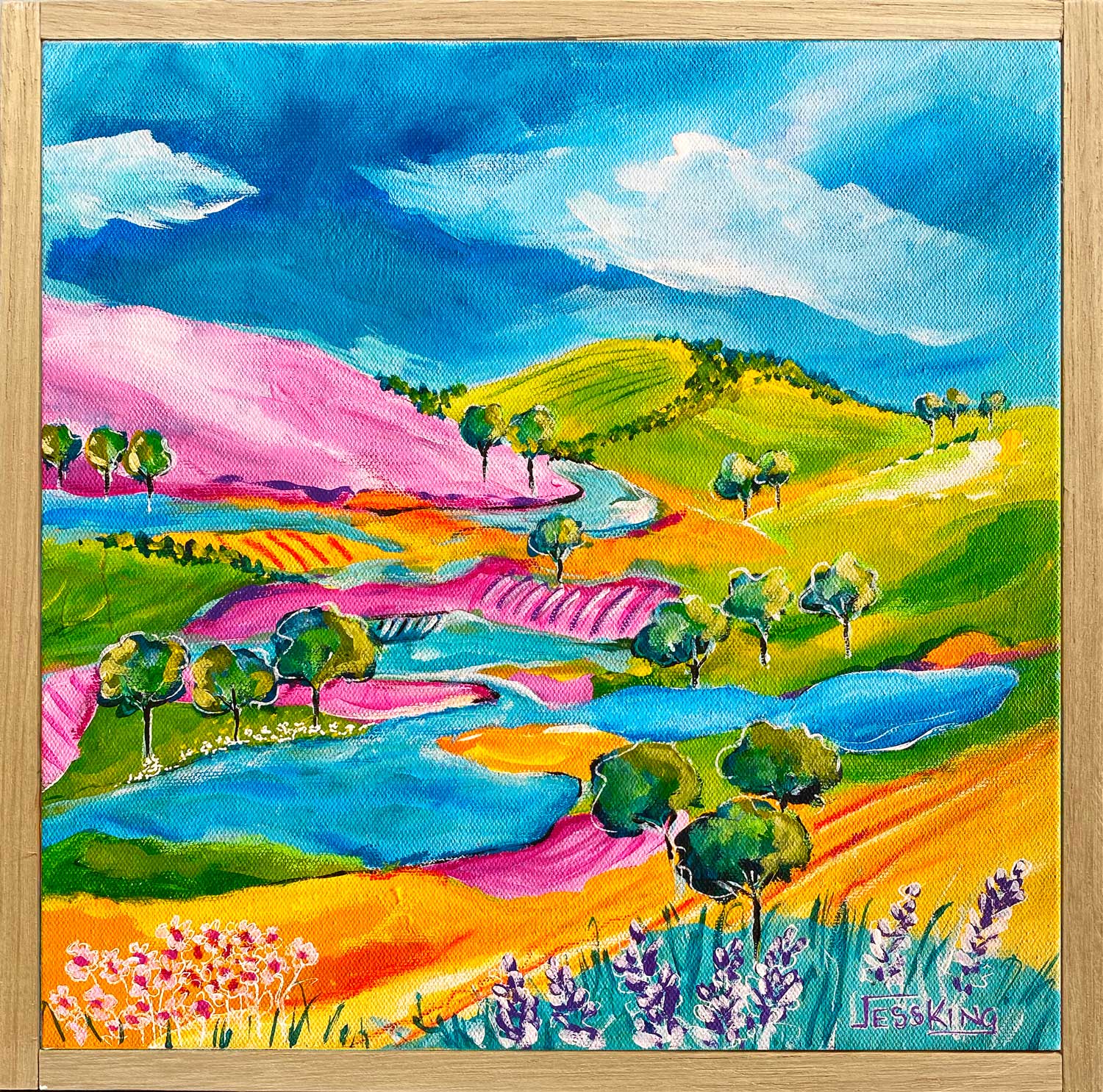 Inspired by a recent holiday to Rainbow Beach the rolling hills drew me in and I could feel the colours rolling into one another. The scenery on the journey was breath taking and this is my interpretation of the beauty of nature.