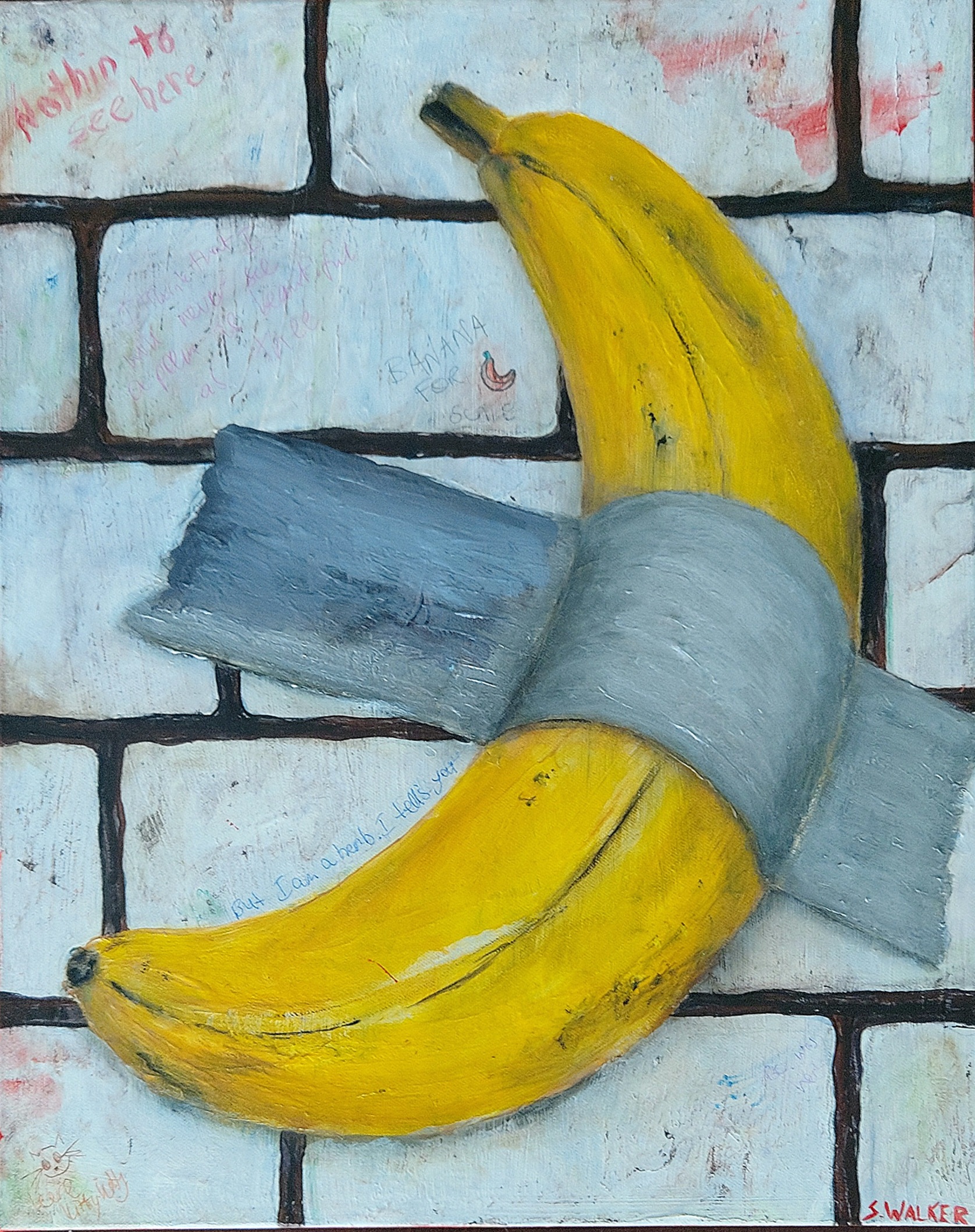 Sarah Walker’s piece Just Another Fruit in the Wall is part tongue in cheek of Pink Floyd’s another brick in the wall, and the artwork that caused controversy – the comedian – aka the banana duct taped to the wall.