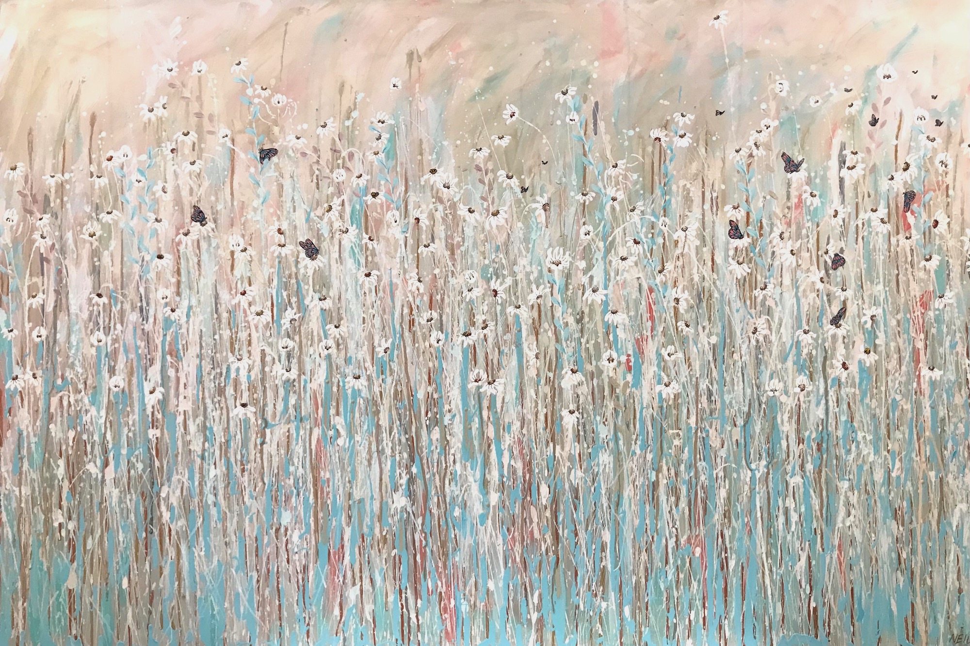 When I am stressed the first thing I do is to go for a walk and connect with my family and nature. Recently there has been an influx of butterflies and ladybugs, and it has been a wonderful reminder to see the small things which bring us joy: these are hidden amongst the painting.