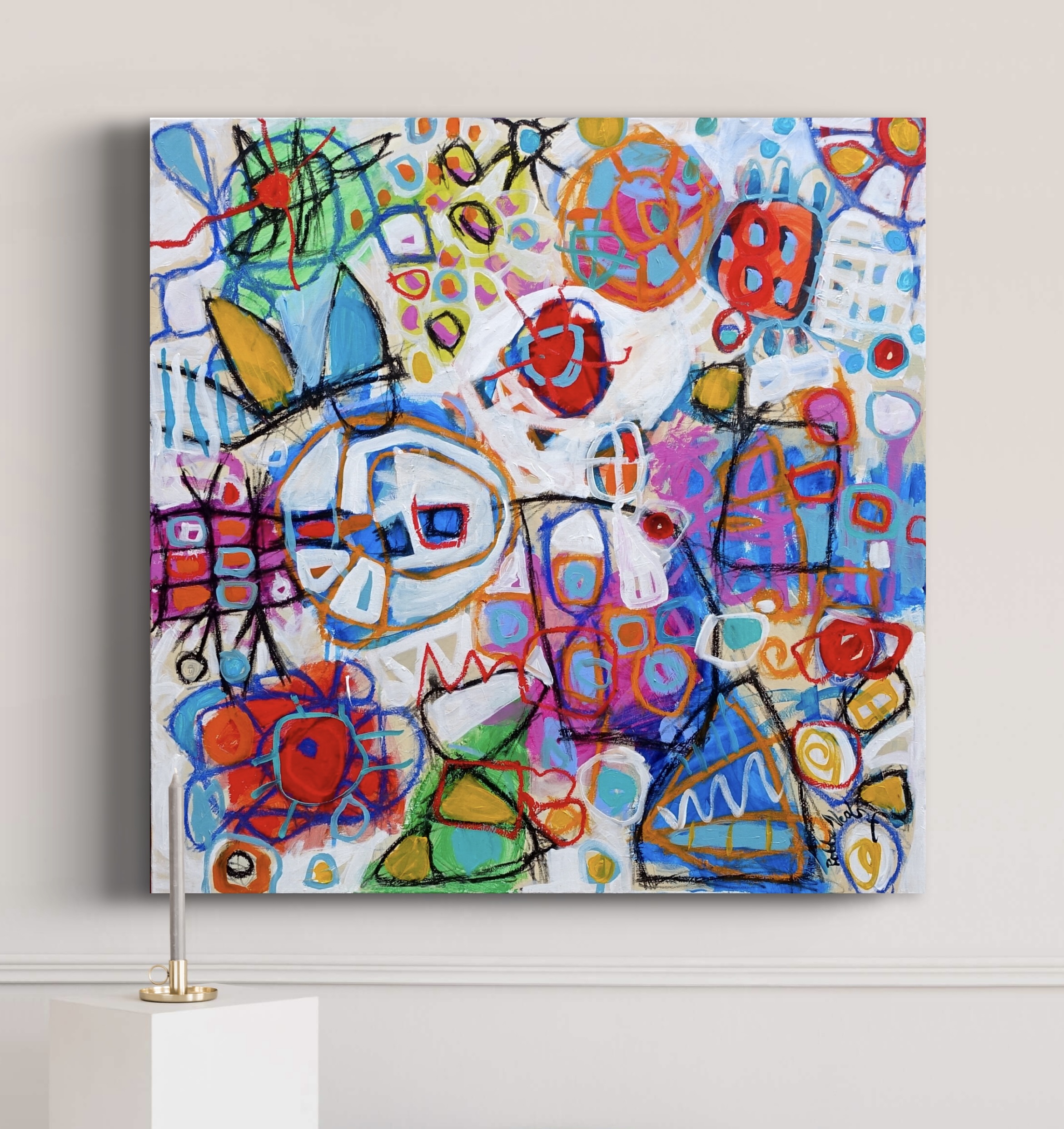 Artist Statement: Paintings each tell a story and take their own journeys and sometimes I can tell you what they are about in detail and sometimes I cant. This one is about joy.