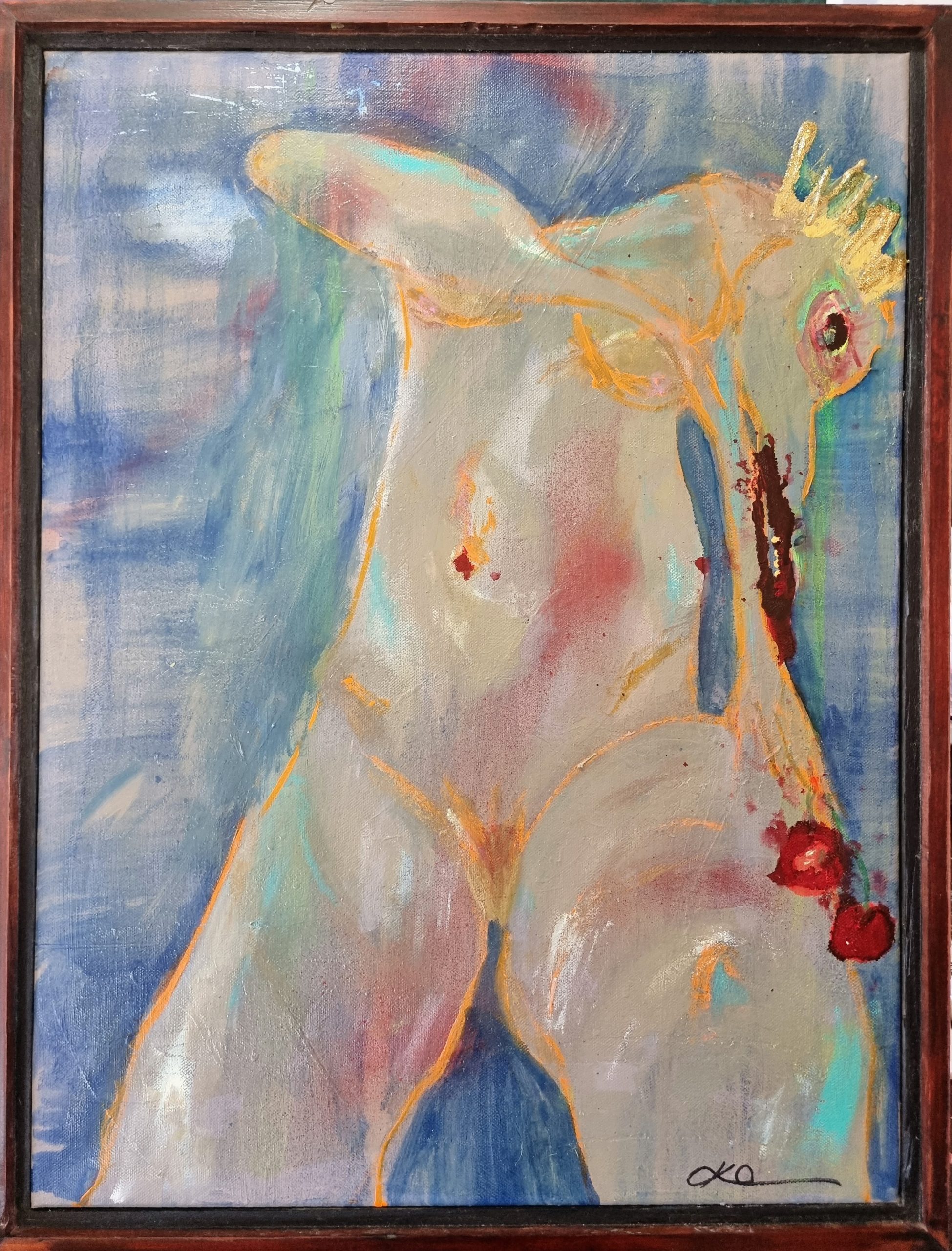 Acrylic, oil pastel and ink on canvas framed in wooden framed with shadowline recess. 49x64cm