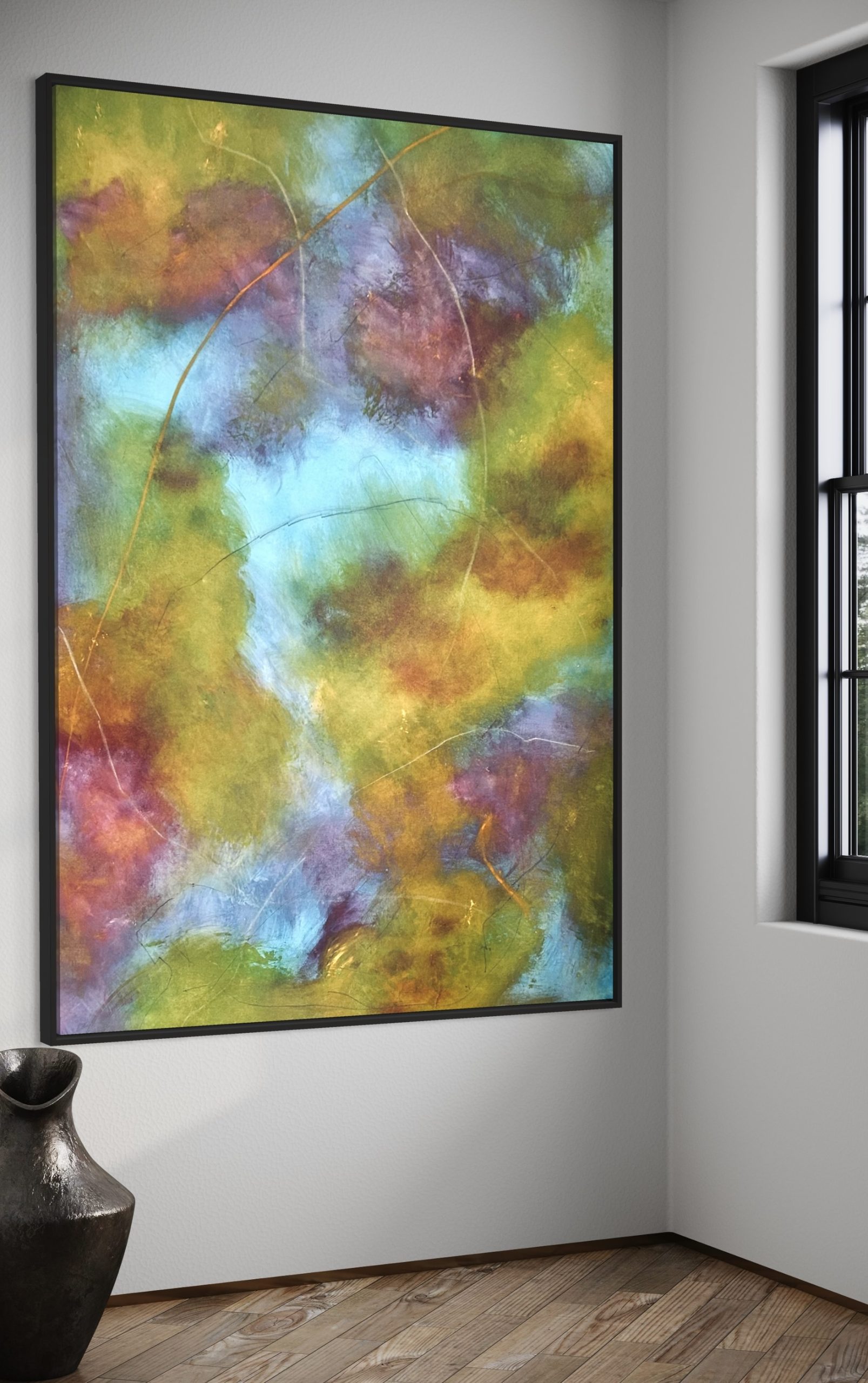 The canvas is a symphony of burnt yellow, sky blue, violet, and hedge green, creating a harmonious dance of hues that evoke a sense of spontaneity and emotion. The mottled colors intermingle, giving the piece a dynamic and textured appearance that draws the viewer in for a closer look.
