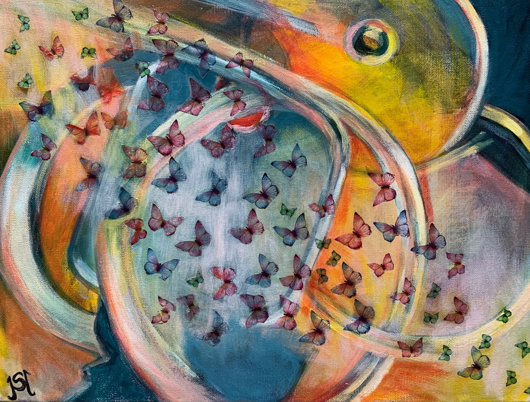 I photographed a bunch of keys close up and from the blurred outlines of the keys I used elements from them to paint in shapes with acrylic colour on canvas.   Butterfly shapes were cut out from tissue paper to create the swarm/kaleidoscope of butterflies giving some movement to the  whole.
