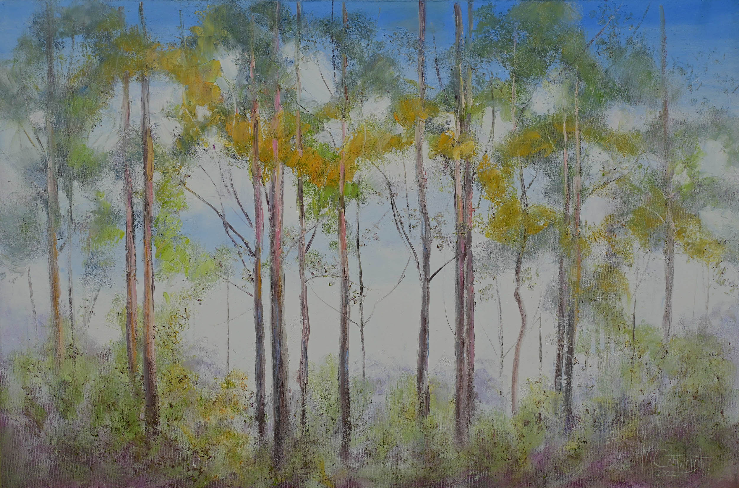 Karri trees are eucalyptus trees which are native to south Western Australia. I was inspired by their tall, colorful trunks and masses of golden foliage contrasting against the dark blue sky. A textured landscape spontaneously painted in alla prima style using mainly palette knife.