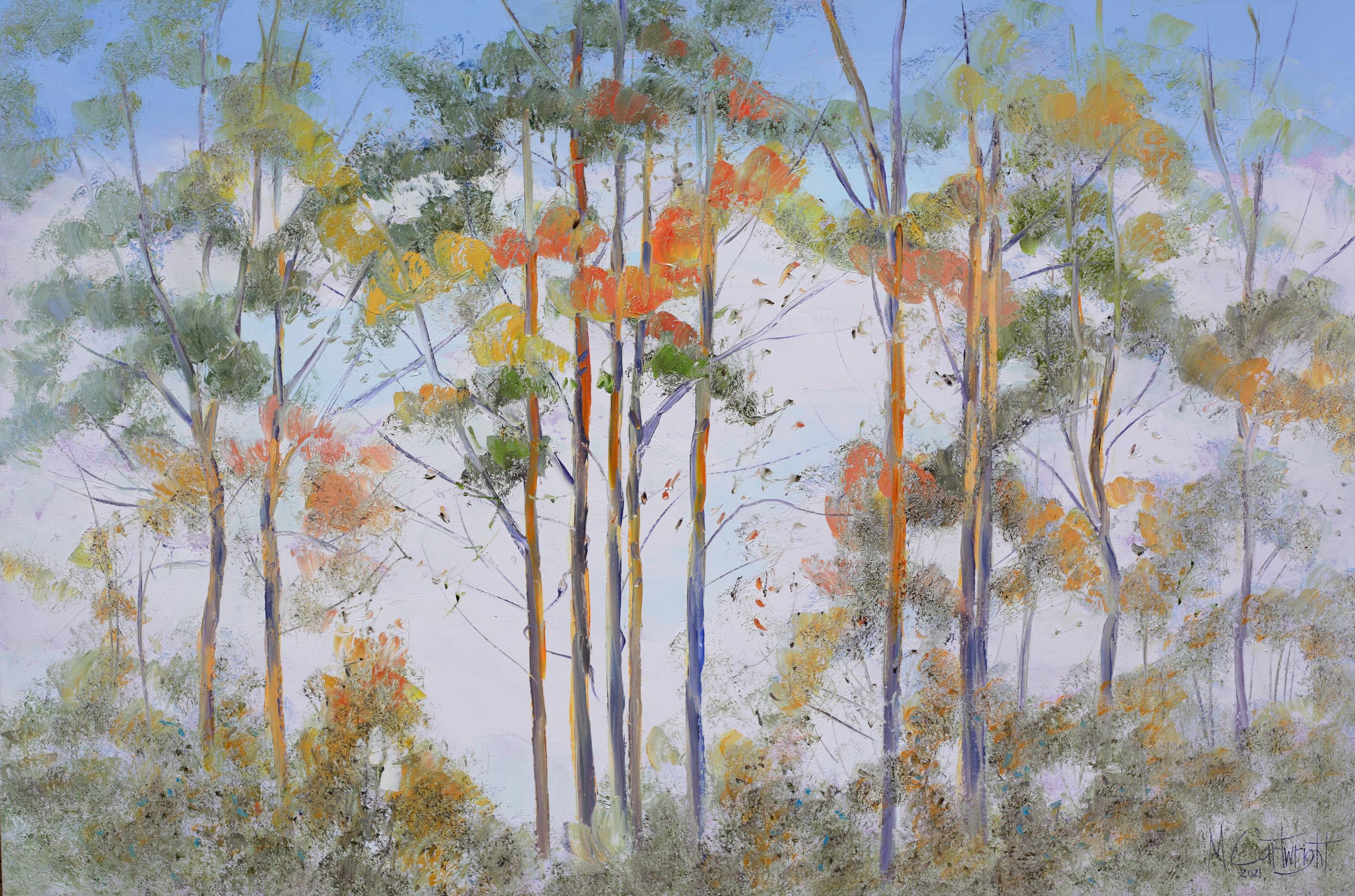 Karri trees are unique to south Western Australia. They grow in the forests, along the roadsides and throughout the countryside. These tall eucalyptus trees make great painting subjects, especially in late summer when their bark begins to peel, revealing beautiful reds, pinks and ochres. A textured oil painting rendered using mainly palette knife but with a few brushstrokes to create variation in texture.