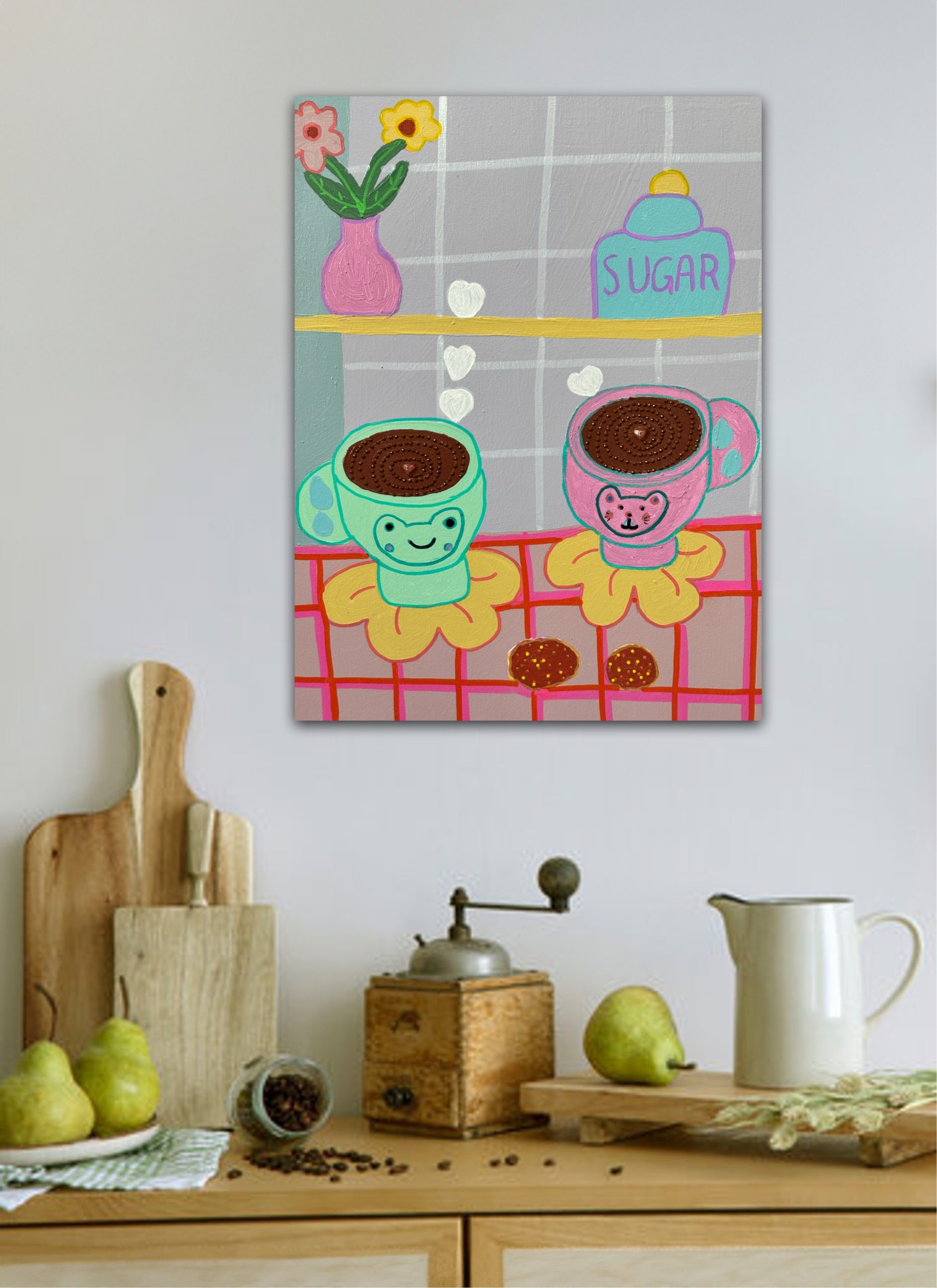 Inspired by a quiet café moment in Japan, Kawaii Coffee Break captures the joy of everyday rituals — coffee, biscuits, and the warmth of shared company. Featuring a frog and cat mug painted in Kim Magee’s signature whimsical folk-art style, this pastel-toned piece radiates sweetness and nostalgia.