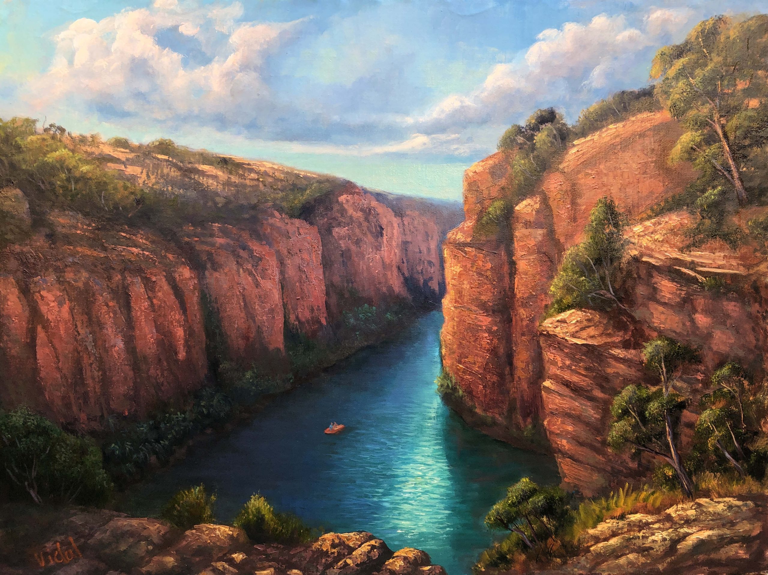 This is the Lawn Hill Gorge. The vivid red cliffs and serene turquoise waters are masterfully captured, evoking a sense of tranquillity. The intricate details and vibrant colours transport you to this natural wonder, inviting you to embark on a peaceful journey through the gorge’s majestic landscape. The small boat gliding through the water invites the viewer to imagine themselves immersed in this natural wonder, feeling the peaceful embrace of the gorge’s towering walls.