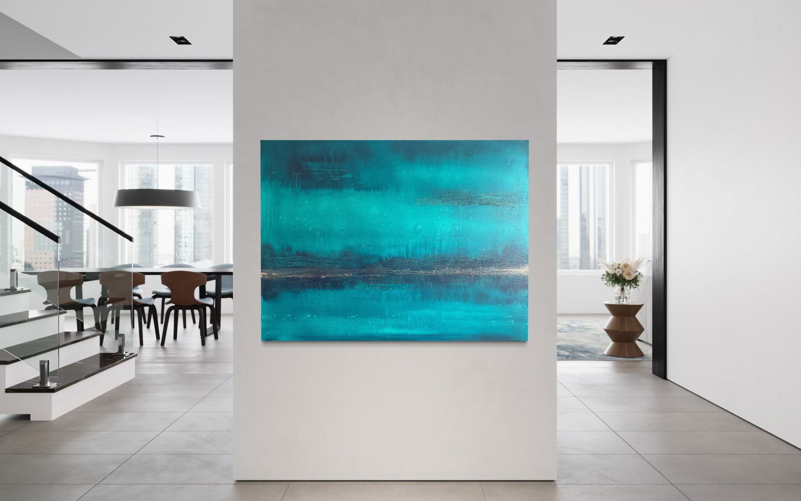 Keep Me Home by Nadine Hobson – This beautiful statement artwork in the most beautiful teal blue is a dreamy and calming vista, reminiscent of the view over the ocean at night. That brief time between twilight and complete night, where you feel a sense of endless possibility.
