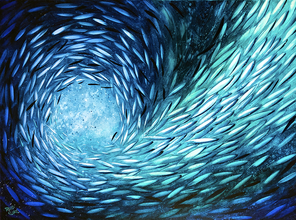 Keep On Swimming by David Clare –Â Oil on thick stretched canvas of a school of fish spinning and swimming out of the canvas. I am endlessly inspired by the magical underwater scenes of schools of fish. Trying to capture the beautiful colours and synchonised movement is almost as hard as catching the fish themselves.