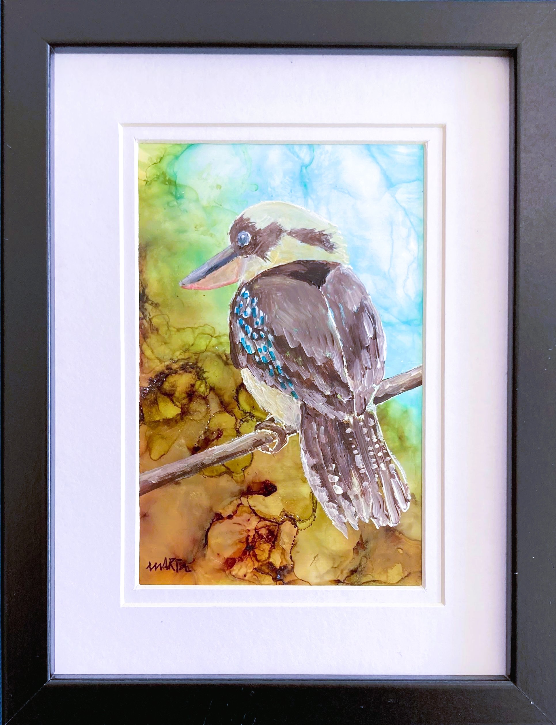 “Keeping Watch”, a striking mixed media painting, captures the iconic Australian kookaburra. Perched on a branch and alert to its surroundings, the bird is brought to life with vibrant detail and rich tones. The flowing alcohol ink background evokes the light and movement of the Australian bush, offering a beautiful contrast to the detailed plumage of the bird.