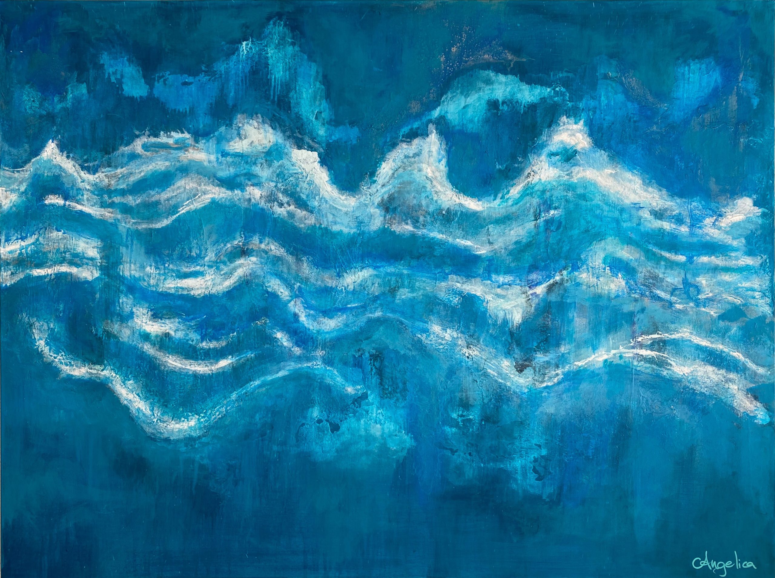 The intense ray of blues used with white capture the depth and power of the sea, while dynamic brushstrokes evoke the raw energy of waves crashing.