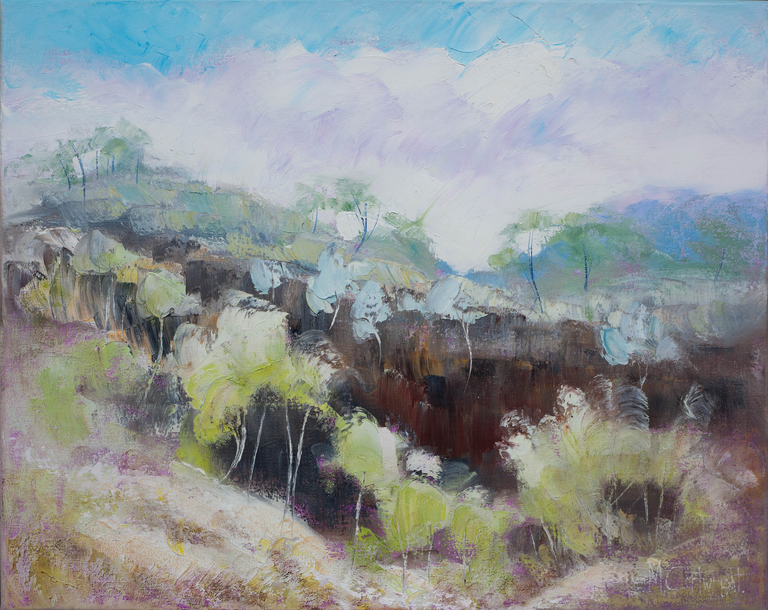 A semi abstract impression of the beautiful Kimberley region in North Western Australia. A textured landscape, spontaneously rendered in alla prima style, using a palette knife. Artist quality oil paint.