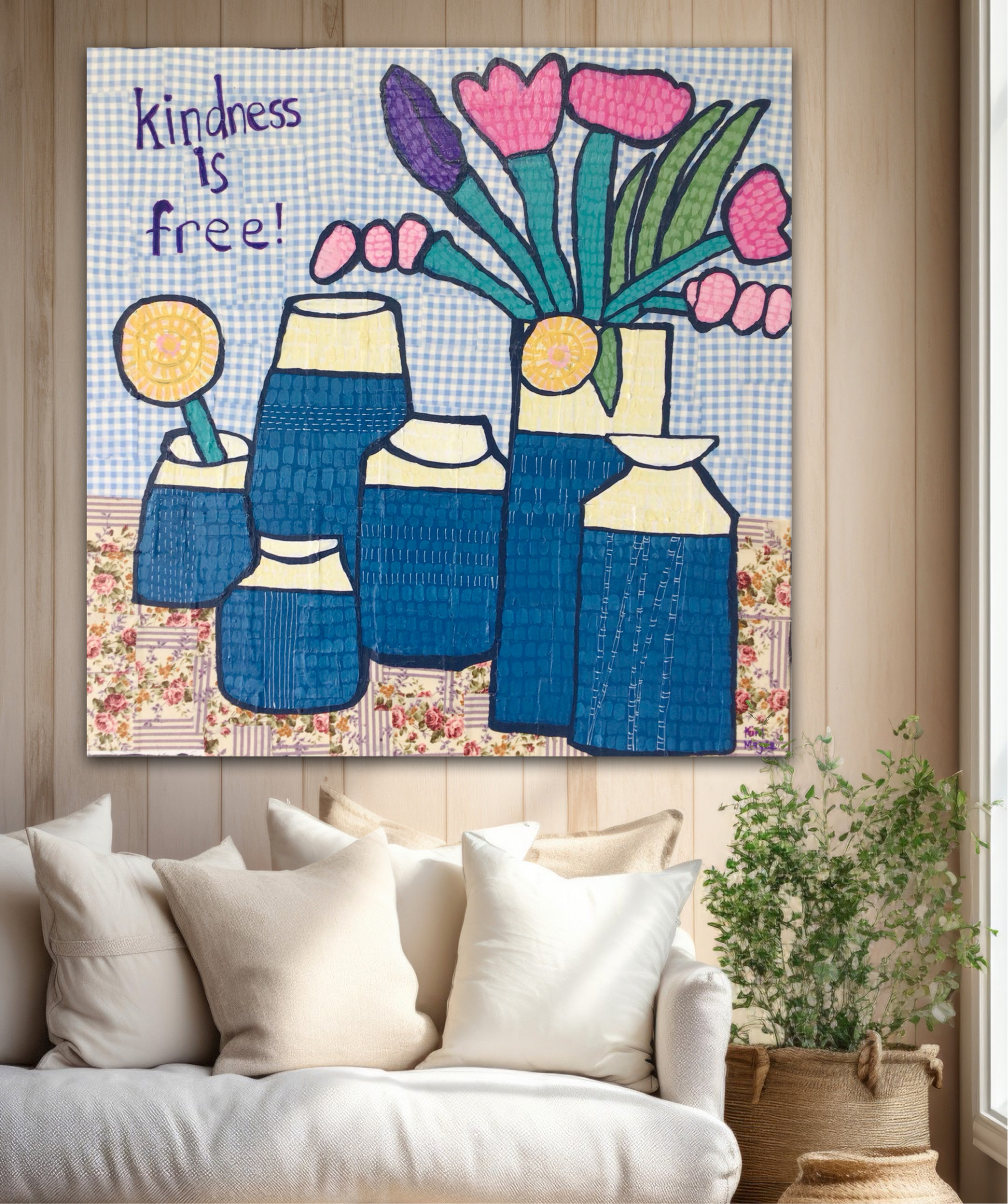Original mixed media collage painting on canvas by Australian artist Kim Magee. The vibrant still life piece features vases and flowers in a multi-coloured palette, measuring 60cm x 60cm x 2cm. This signed artwork comes with a certificate of authenticity issued by the artist and is ready to hang. Perfect for any art lover, this piece is a beautiful reminder of the importance of kindness.