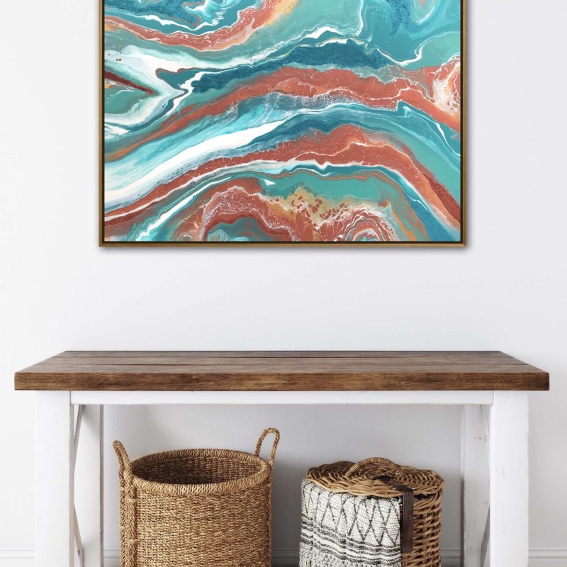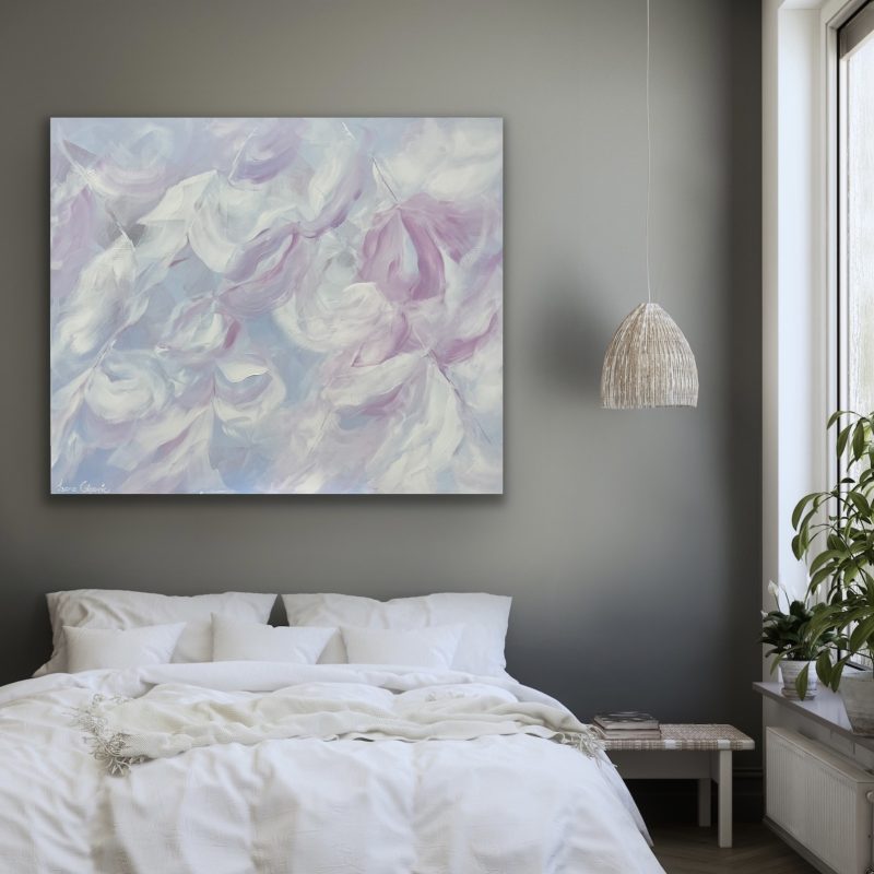 All edges Gallery-wrapped with the colours of the painting. Ready to hang with D-Rings and plastic-coated wire.