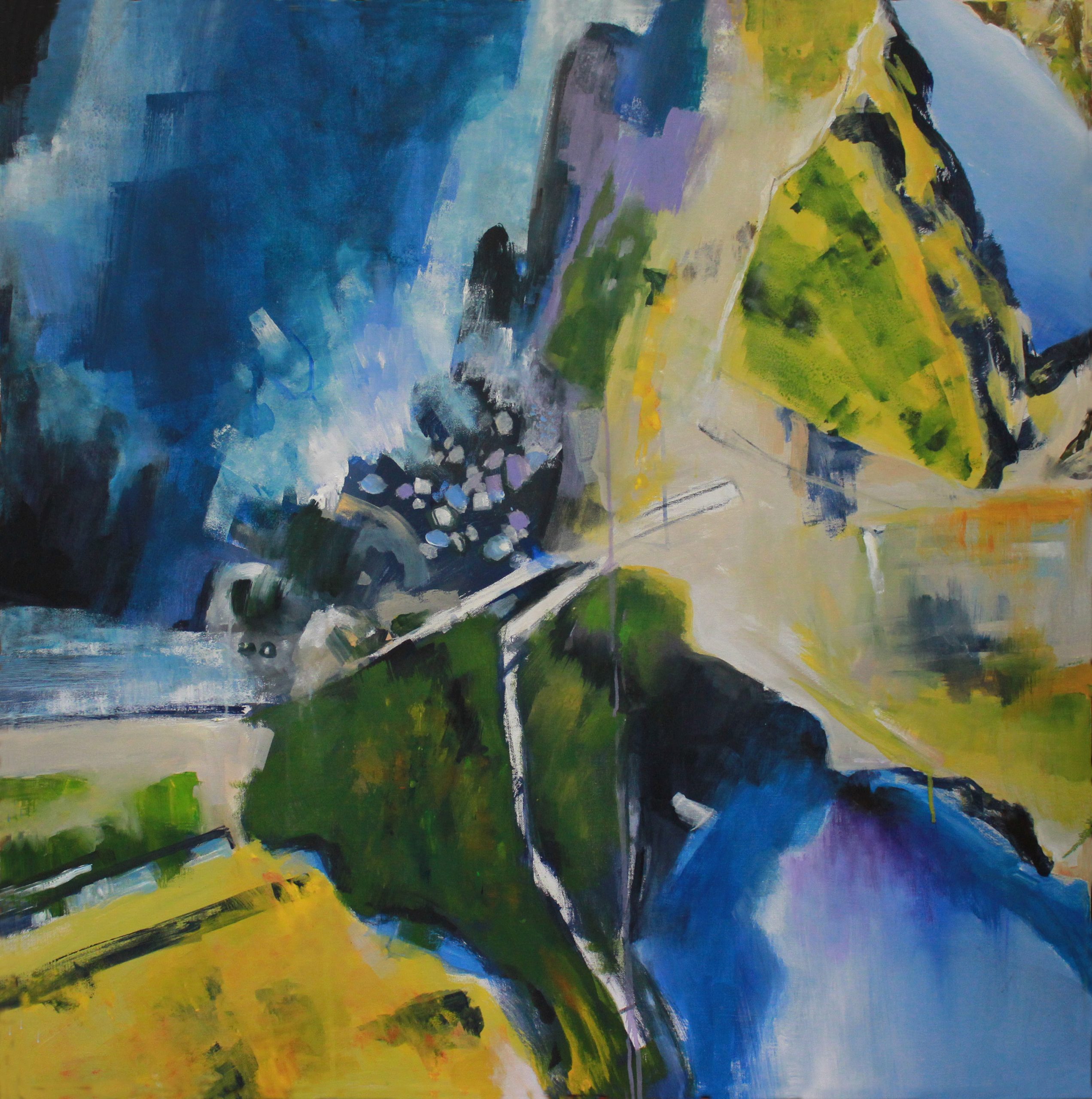 The subject matter lends itself well to abstraction and the mixed media of acrylic, charcoal and pastel enable this work to emulate the network of tracks and bridges that divide the sections of the jutting cliffs.