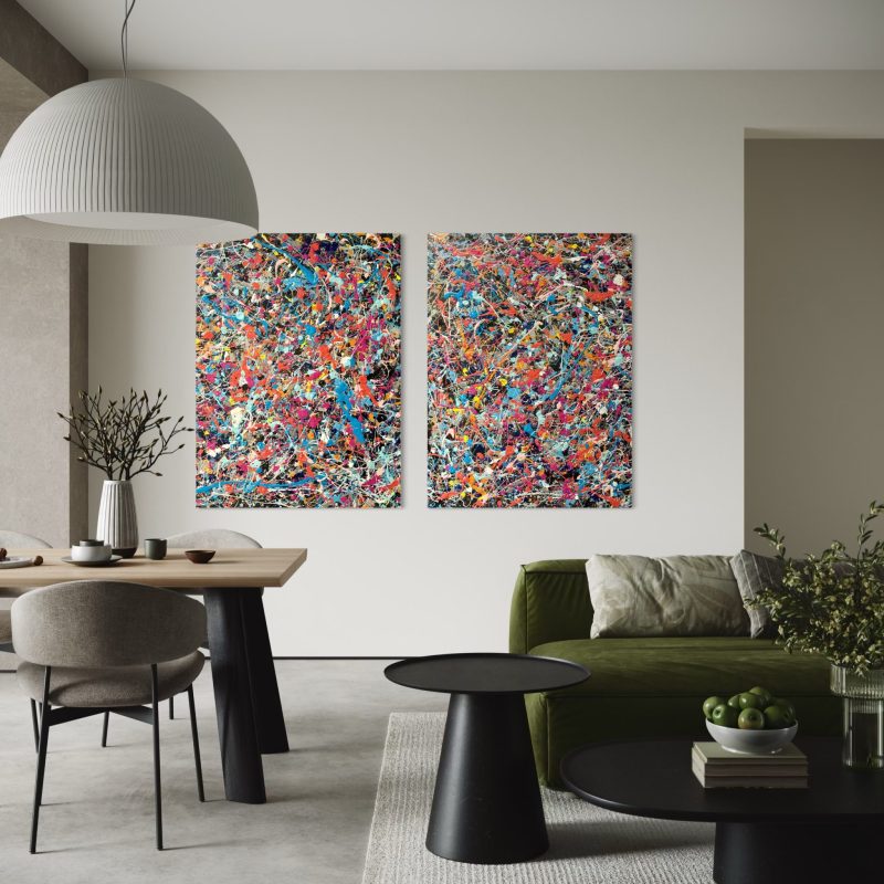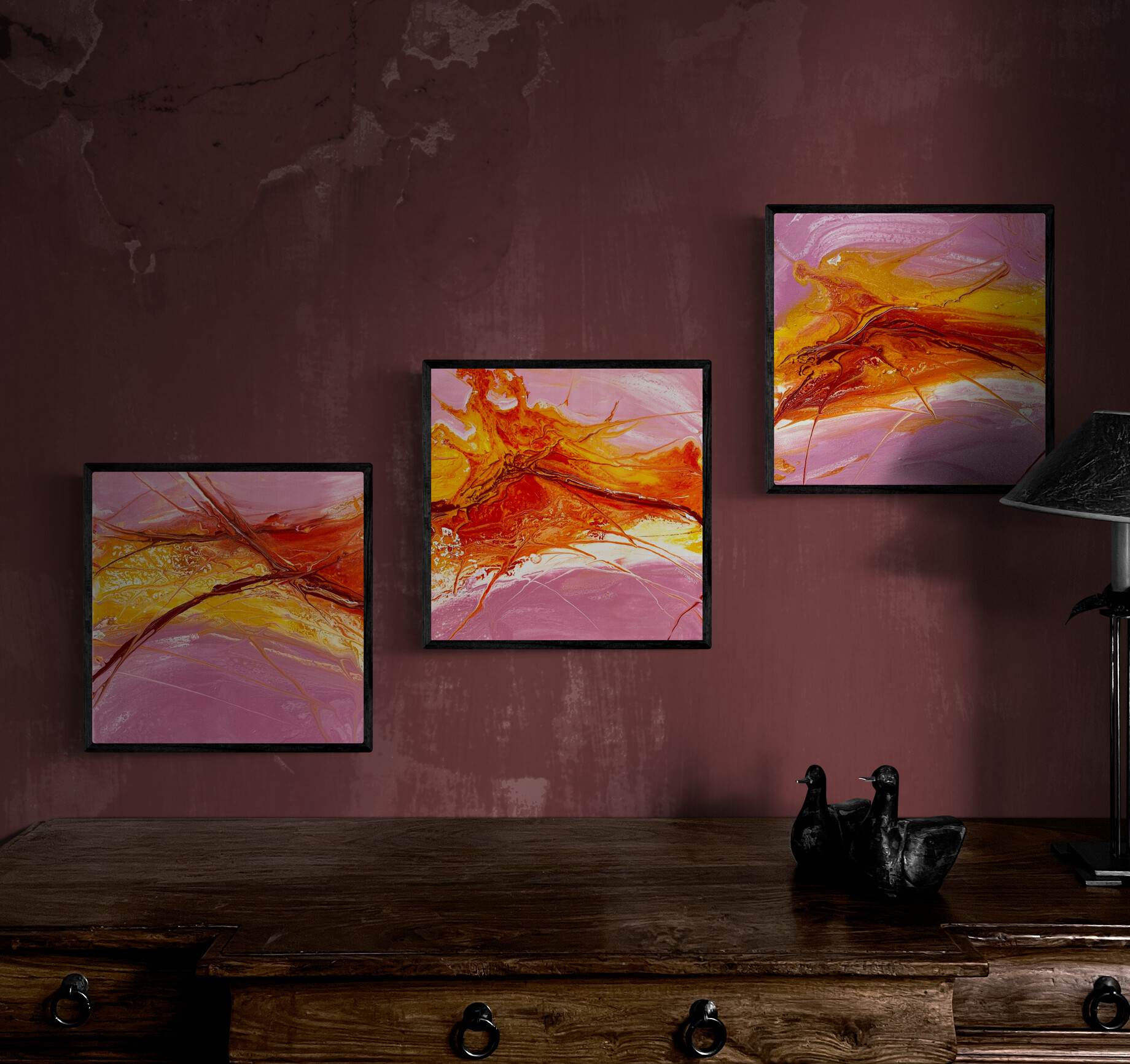 Influence: This fun little triptych is mischievous and bold. Using the acrylic pour method in bright yellows and reds, it mimics the cheeky, bashful kisses shared amongst shy young lovers.