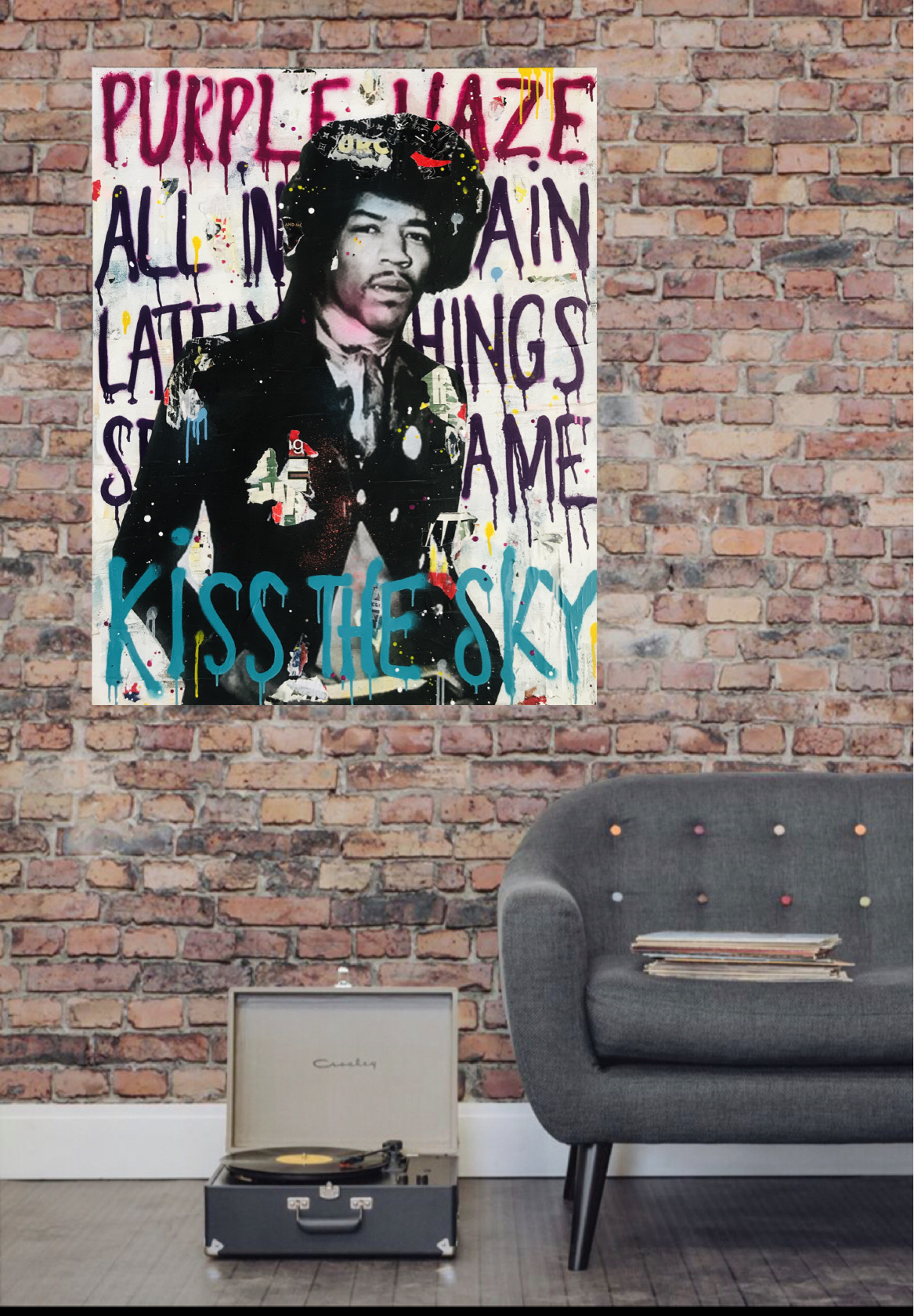 The main vintage image Hendrix was then added and then further overlaid with paint and paper to give a worn rustic appearance.