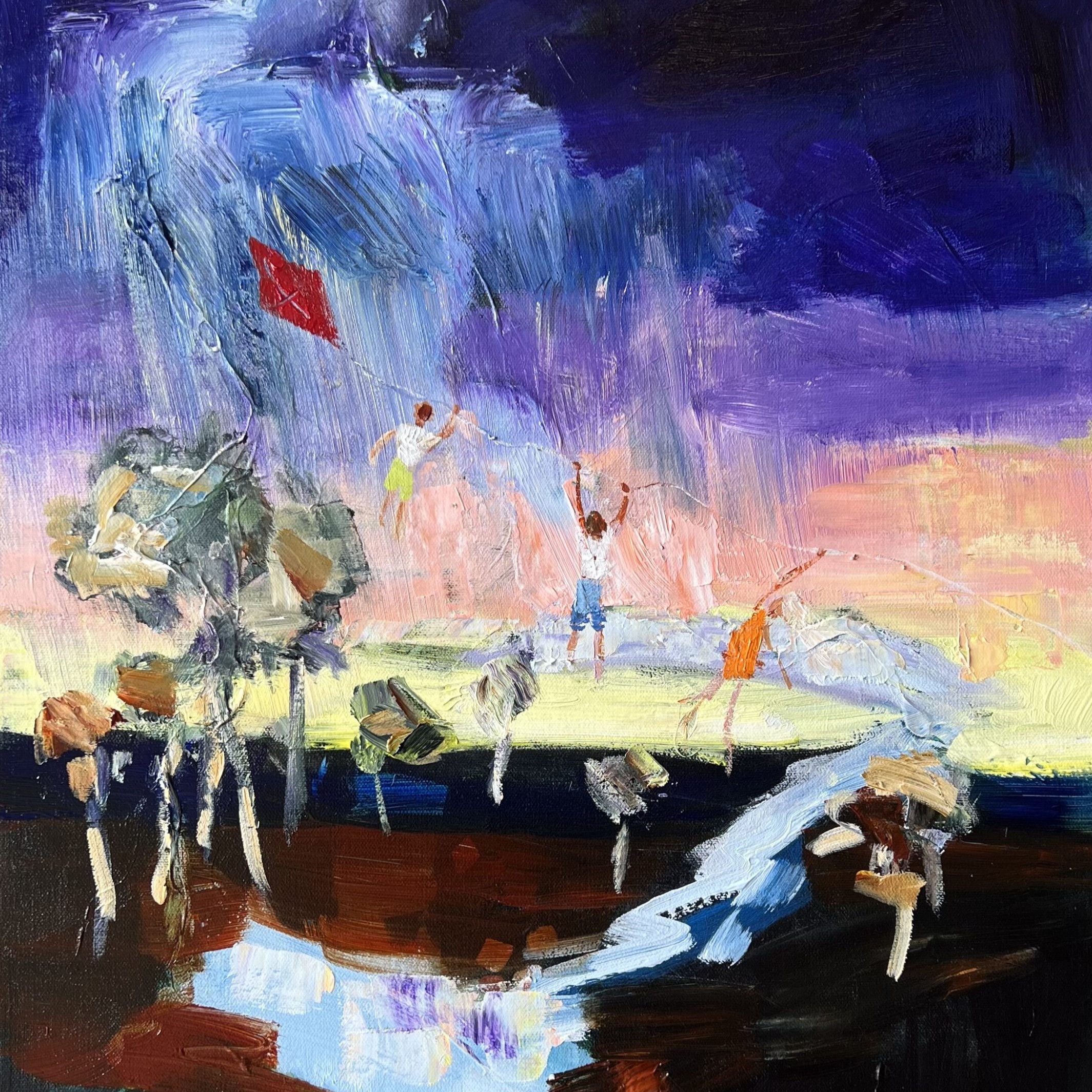 Kite Flying Kids by Meredith Howse is a colourful artwork that captures the essence of childhood and the joy of outdoor play. The painting depicts a three children, flying a kite over the Australian Outback during the sunset. The painting is filled with rich reds, vibrant yellows, and deep blues, reflecting the breathtaking colours of the outback landscape.