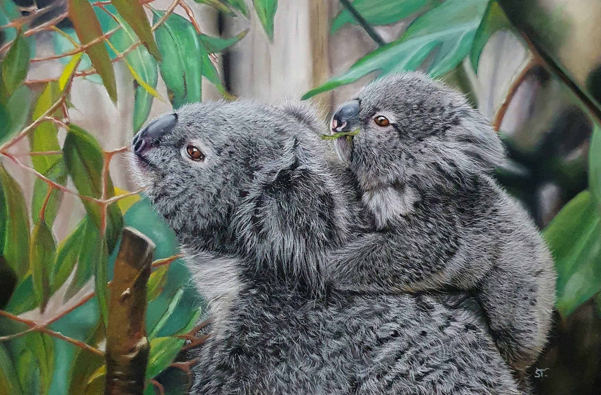This beautifully detailed artwork captures the tender bond between a mother koala and her joey nestled securely on her back. Rendered with exquisite realism, every strand of fur and glimmer of light in their eyes brings these beloved Australian icons to life. The soft eucalyptus leaves framing the scene add a natural warmth, evoking the tranquil beauty of the bush.