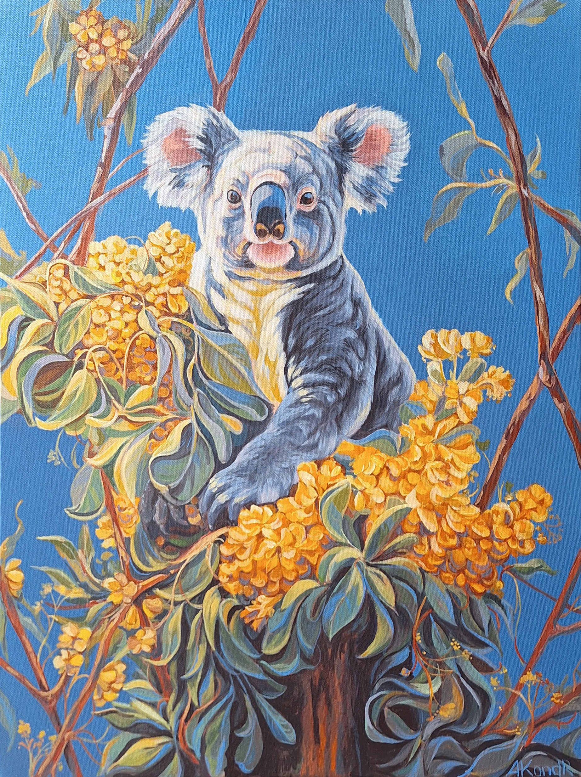 “Koala Encounter” by Angela Kondr – is an original acrylic painting featuring a koala seated on a tree amid yellow flowers against a backdrop of blue sky. Executed in the Australiana style, each color in the artwork symbolizes the diversity and abundance of Australian nature.