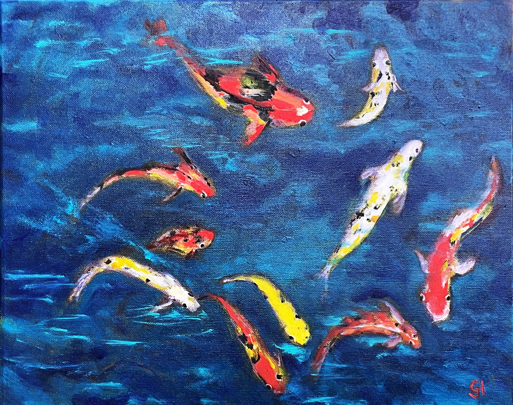 Stretched canvas with a wire across the back, sides painted, Koi swimming in blue and turquoise waters.