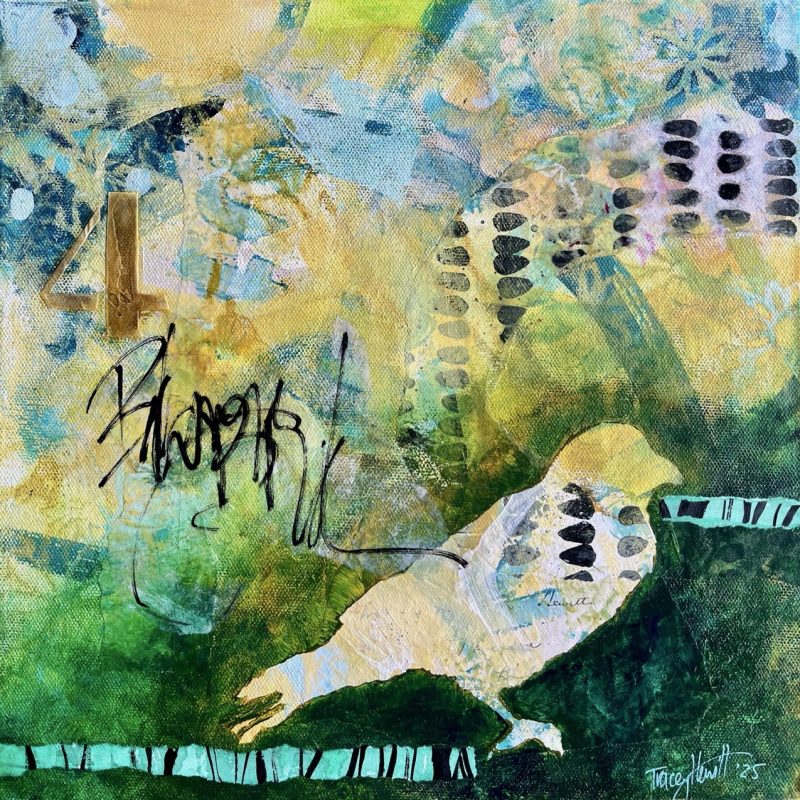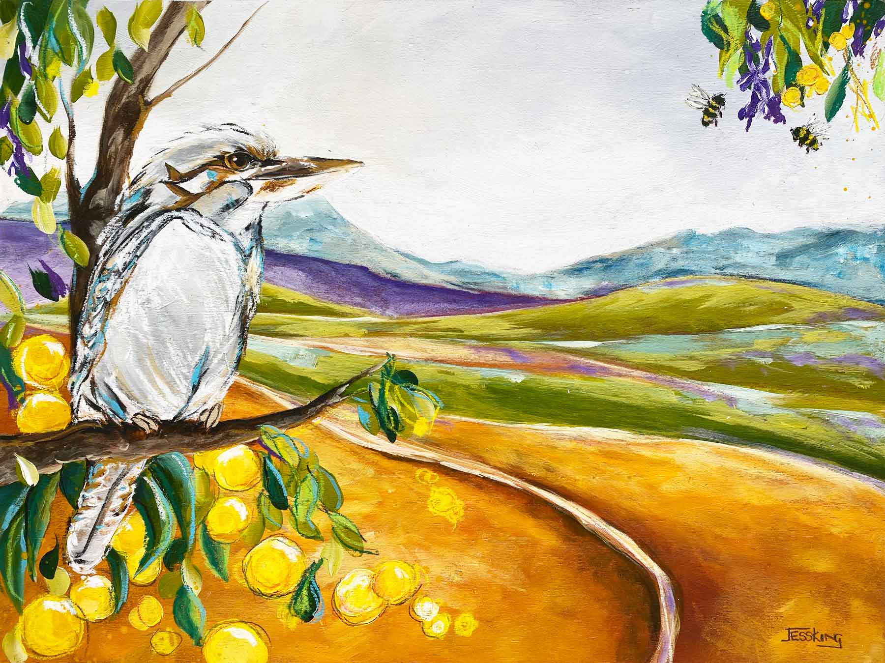 Kookaburra Bee Keeper by Jess King – Original mixed media artwork by Jess king on board of a kookaburra sitting on a branch with beautiful rolling hills. Signed on the front. Hooks and wire across the back.