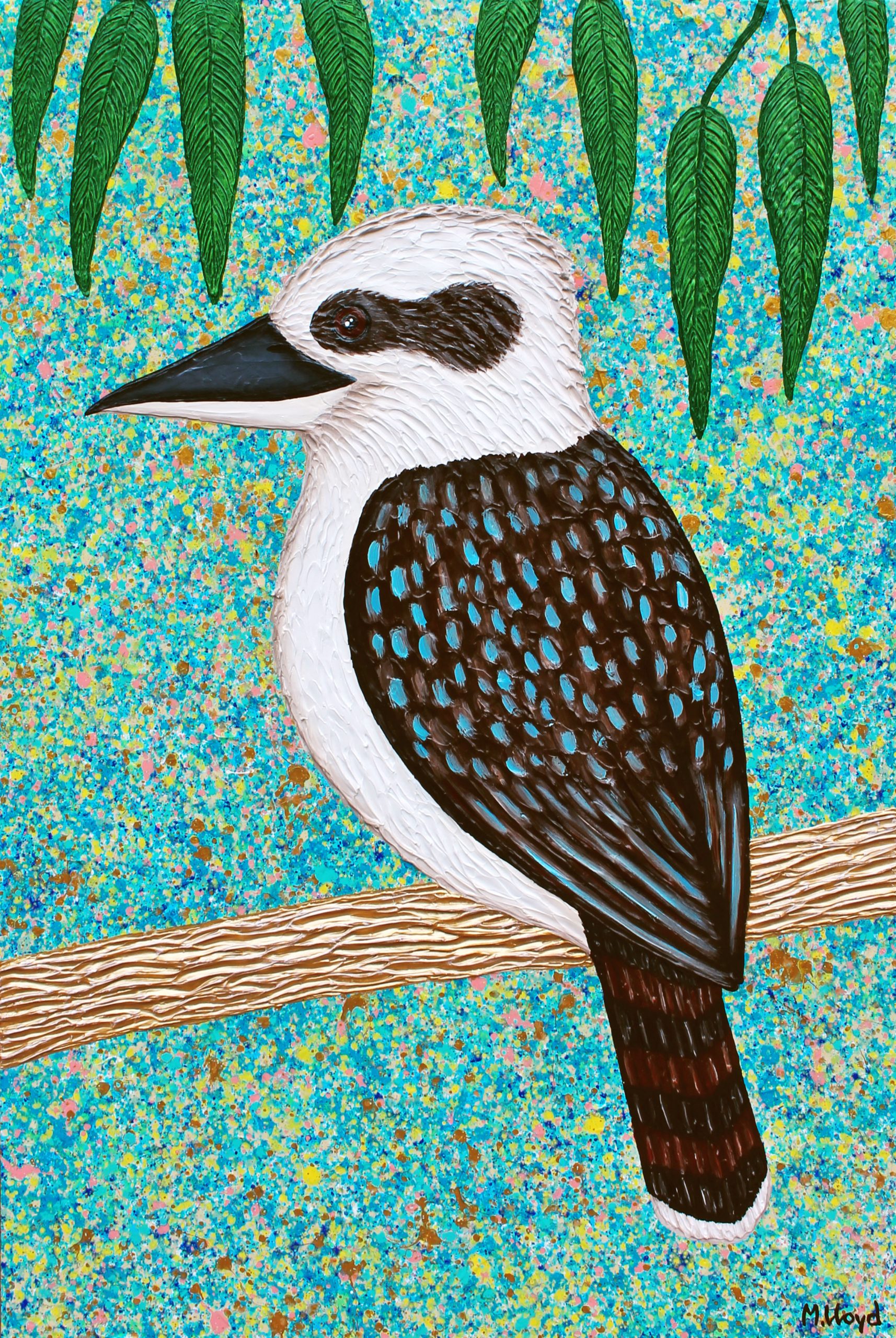 Inspired by living in the Adelaide Hills these guys are regular visitors to our home. I love to hear their laughter always puts a smile on my face. Highly textured painting, painted in my usual modern, abstract style. Background has a light texture with splatters of blues, yellows, golds, pinks, greens, white and deep blue. The branch is metallic textured gold. The leaves and Kookaburra are also very textured. This painting looks much better in real life!