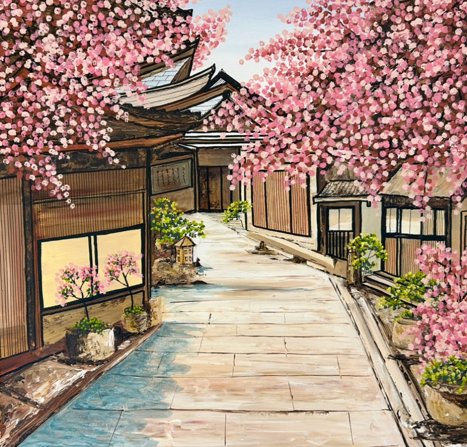 a beautiful //street in Old town Kyoto showing the amazing cherry blossoms. This painting is inspired by my time living in Japan and the influence of the old Japanese wood block prints. Painted around the edges, no need to frame.