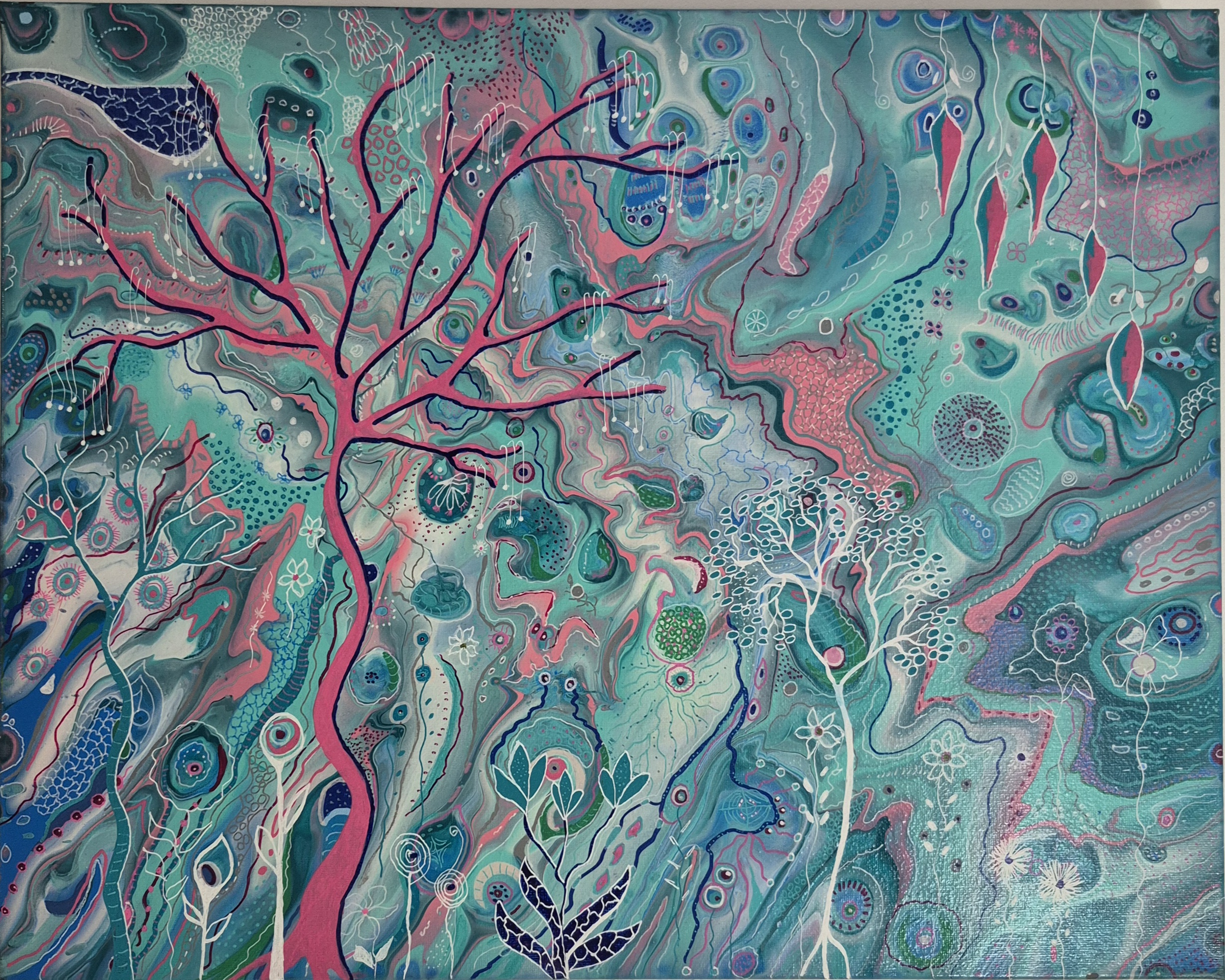 Base acrylic Paint Flotrol and silicone top design acrylic paint and posca art pens. Artwork on stretched canvas