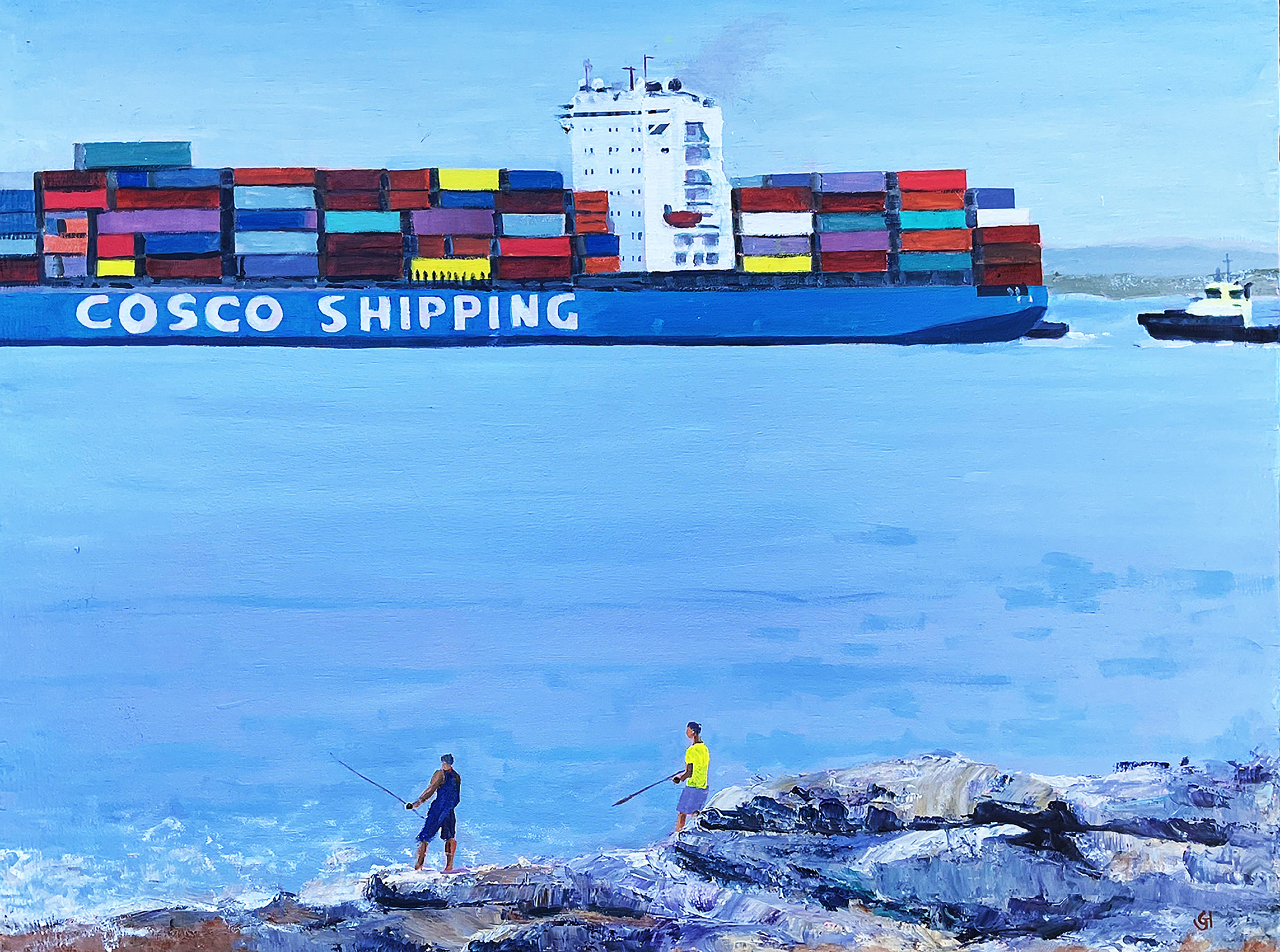 Recently I was at La Perouse (Botany Bay NSW) doing some plein air painting with 2 artist friends. Mt attention was on the fort and the bridge across to it, when my friend directed my gaze across to the waters in front. this large Container ship was leaving port and the two fishermen were in the foreground. I painted this some weeks later in my studio.