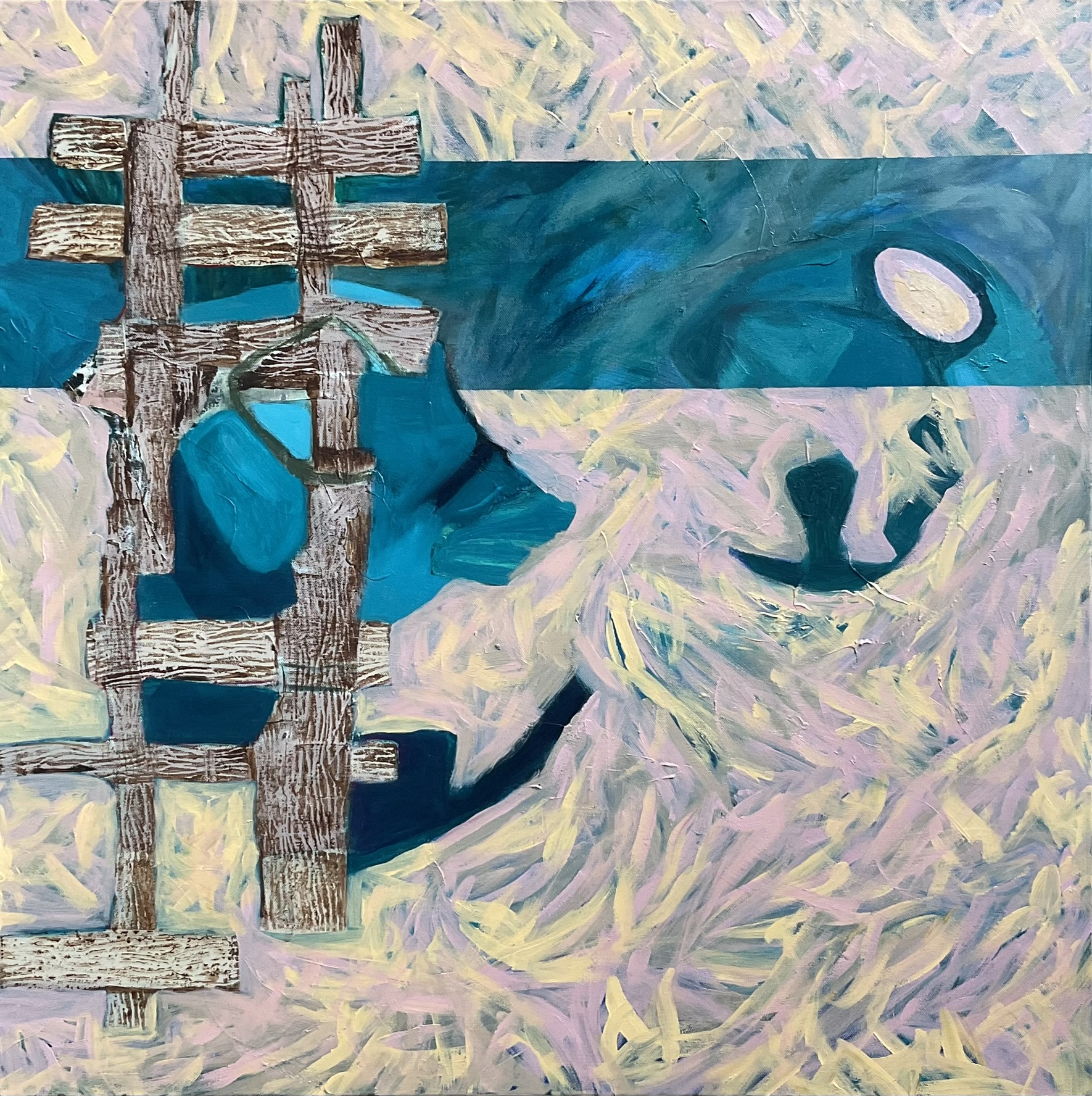 Ladder of Hope by Kathy Best – Hoping for world peace and harmony. Painted with a limited colour scheme and intuitively from my imagination. Ladder created by hand using foam stencil printing method.