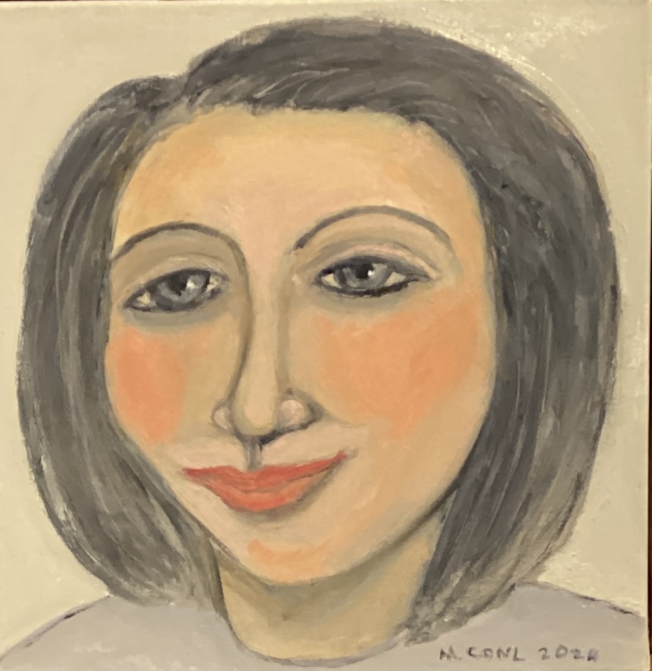 Lady in grey by Margaret Connell – The image is of a lady Margaret encountered in the past and was created from traces of memory of her .The paint colours are used to engender quiet and calm to depict the memory of the lady who was of a quiet disposition and a face was chosen because of Margaret’s life long interest in peoples faces and depicting them in drawings and paintings .Margaret uses colour to depict emotions but also colours are chosen to enhance another colour .This painting is original.