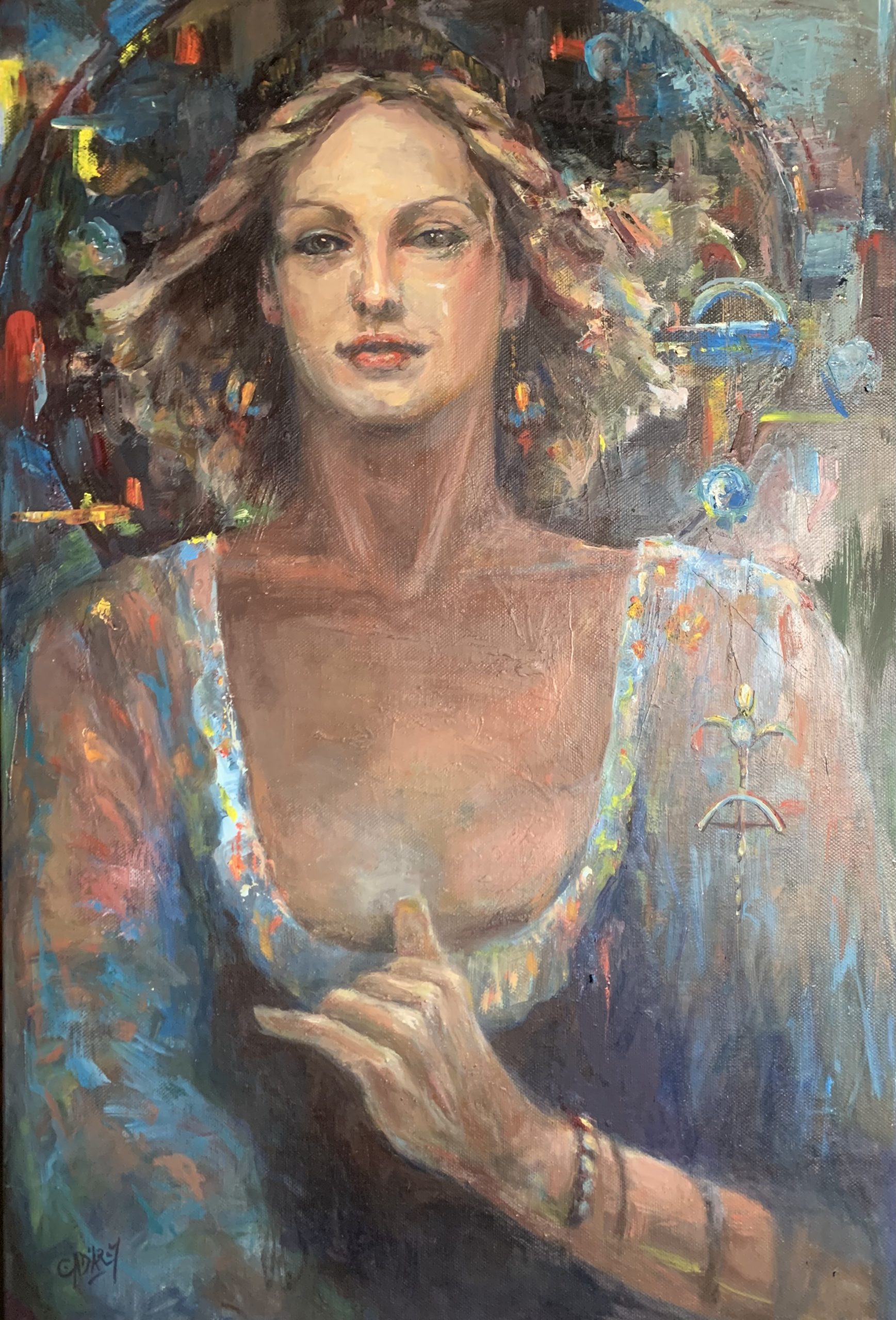 Lady Sophia Shaka by Carol D’Arcy – A mysterious woman dressed in blue emerges toward the viewer. The painting is based around my idea to explore my romanticism regarding the feminine and feminine history juxtaposing this into a contemporary expression. The woman evolved from the canvas on her own and has brought smiles and conversation as she is old world and very modern. She is giving us the “Shaka”. A hand symbol, which is very positive, used by the surfing community. She is mysterious and goddess-like, perhaps an oracle, and reminiscent of the Celts.